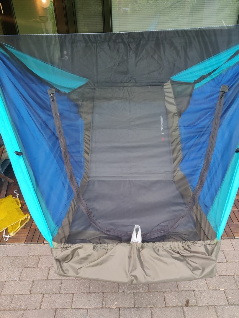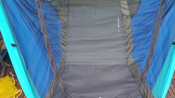 Da ich das Mückengitter am Kopf sowieso um einen 20cm Streifen erweitern musste, hab ich den Bereich des hinteren Durchgreif-Reissverschlusses (zum Eintüteln der Isomatte) auch gleich noch rausgetrennt und spiegel-verkehrt (bzw. spiegel-richtig) wieder eingenäht - jetzt bekomme ich den RVS auch von aussen leichter geöffnet...