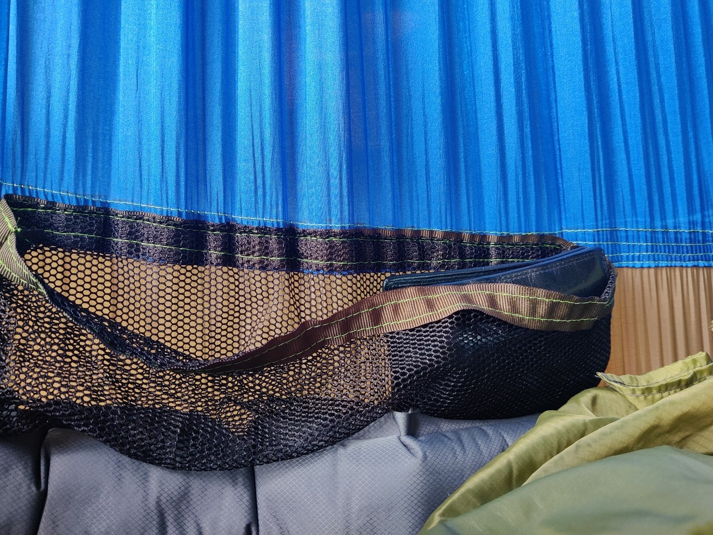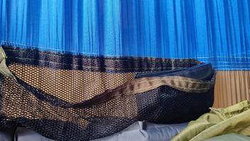 Innen dann noch einen (verstellbaren) Gummizug, damit das Netz über dem Kopf immer straff hängt. Und einen zusätzlichen kleinen RVS im Kopfbereich zum Durchgreifen (Isomatte reintüteln) und zum Durchlüften falls gewünscht. (Wenn ich den vorher ins Netz eingearbeitet hätte, wär das Nähen etwas leichter gewesen.)