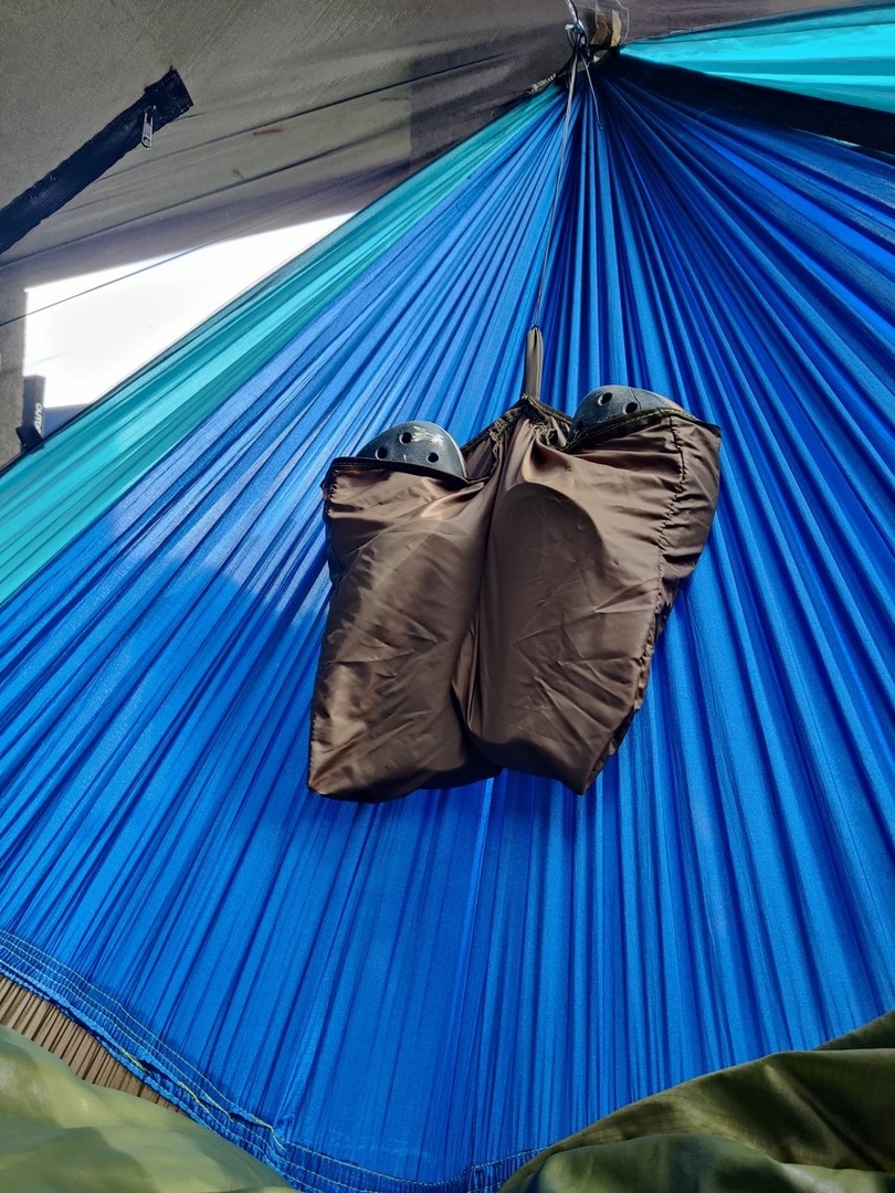 seitlich hängende Schuhtasche, kollisionsmeidend und tropfunbedenklich = seitlich raus aus dem Schlafbereich: