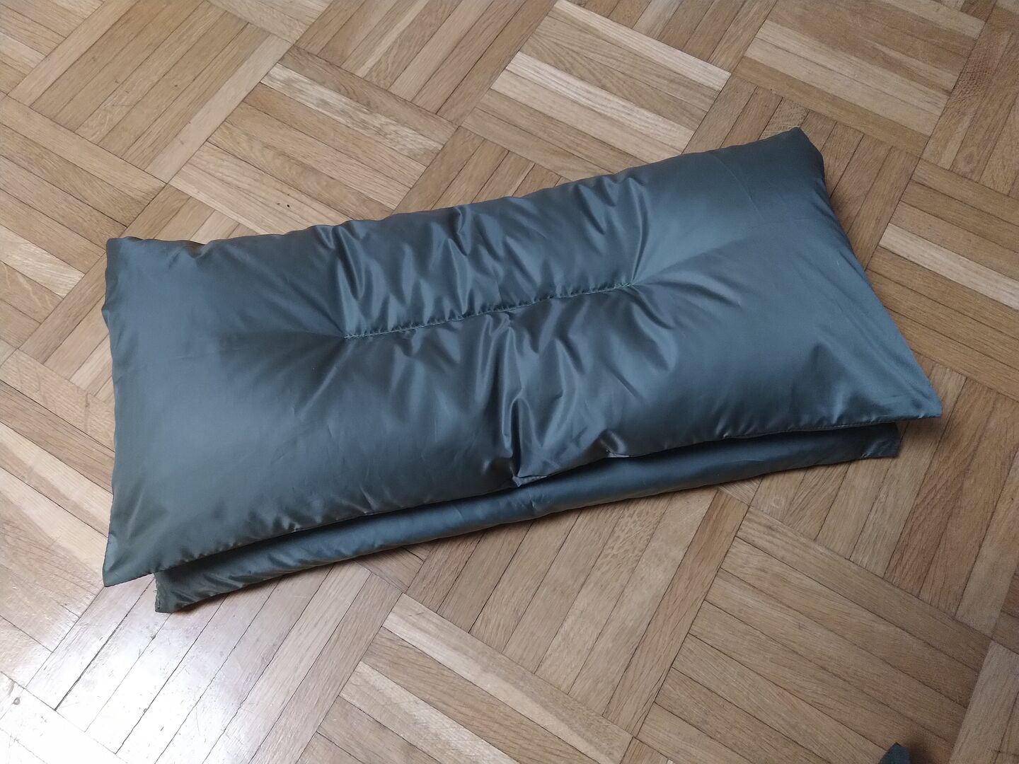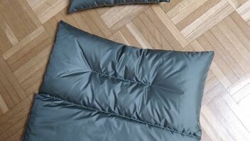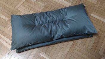 Zuerst hatte ich eine kleine Menge der ca 80g übrigen Daunen aus dem kleinen in eine Hälfte des großen Kissens verschoben und die andere Hälfte mit Apex-ähnlichem Material gefüllt, um etwas mehr Spannkraft unter mir zu haben.