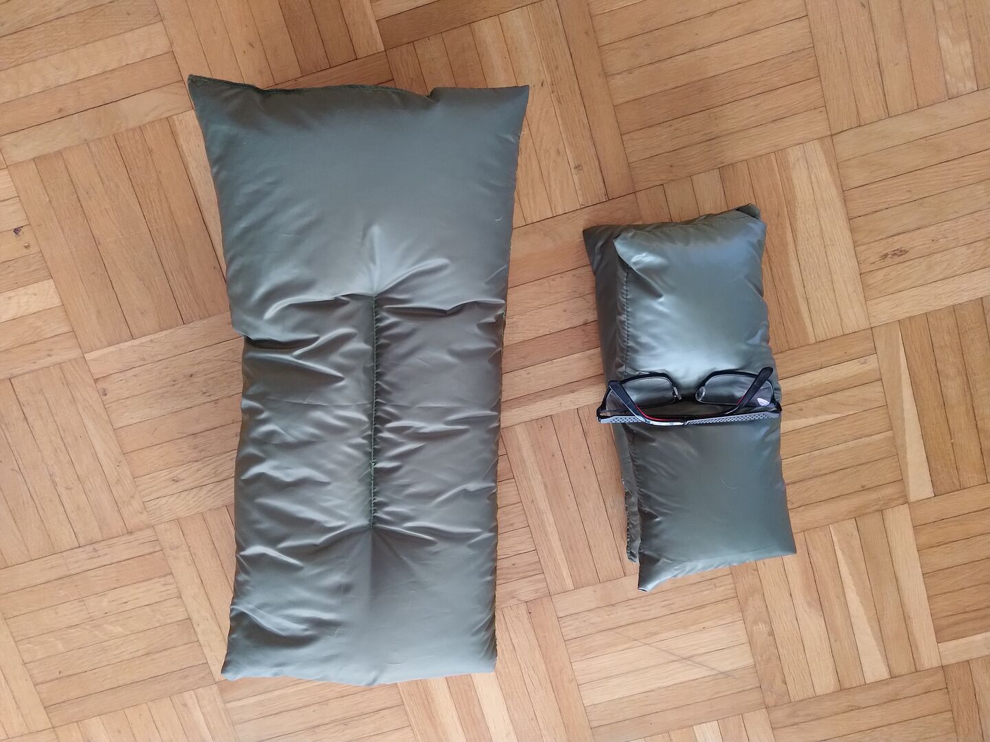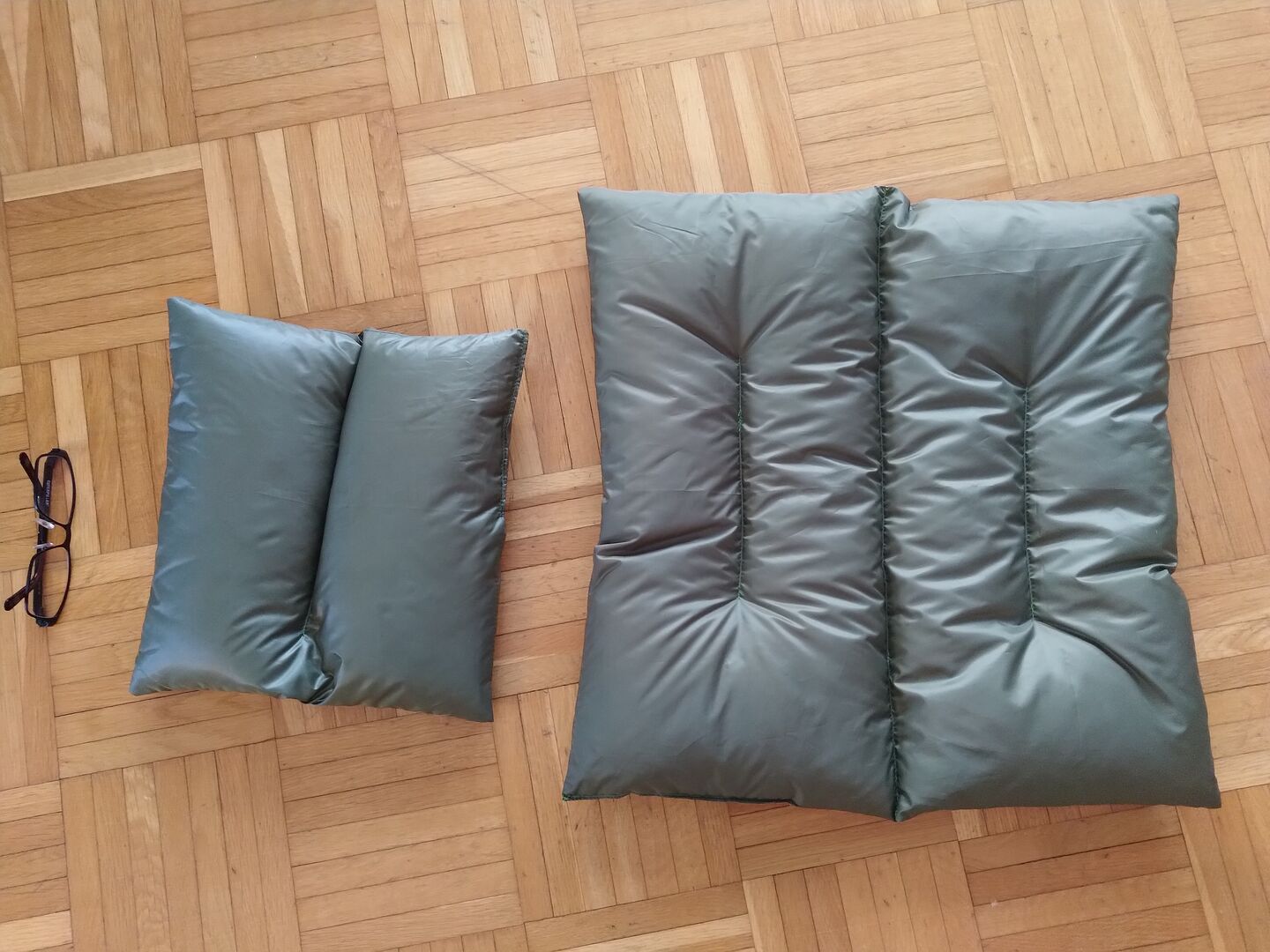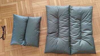 Dadurch hatte ich gefühlt aber immer noch zu viel Daune im prallen, kleinen Kissen drin, und das große war vom Packmass her auch nicht ideal und weniger anpassbar.