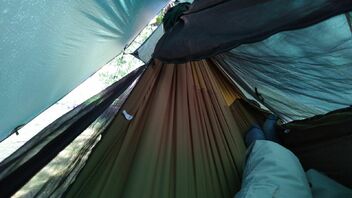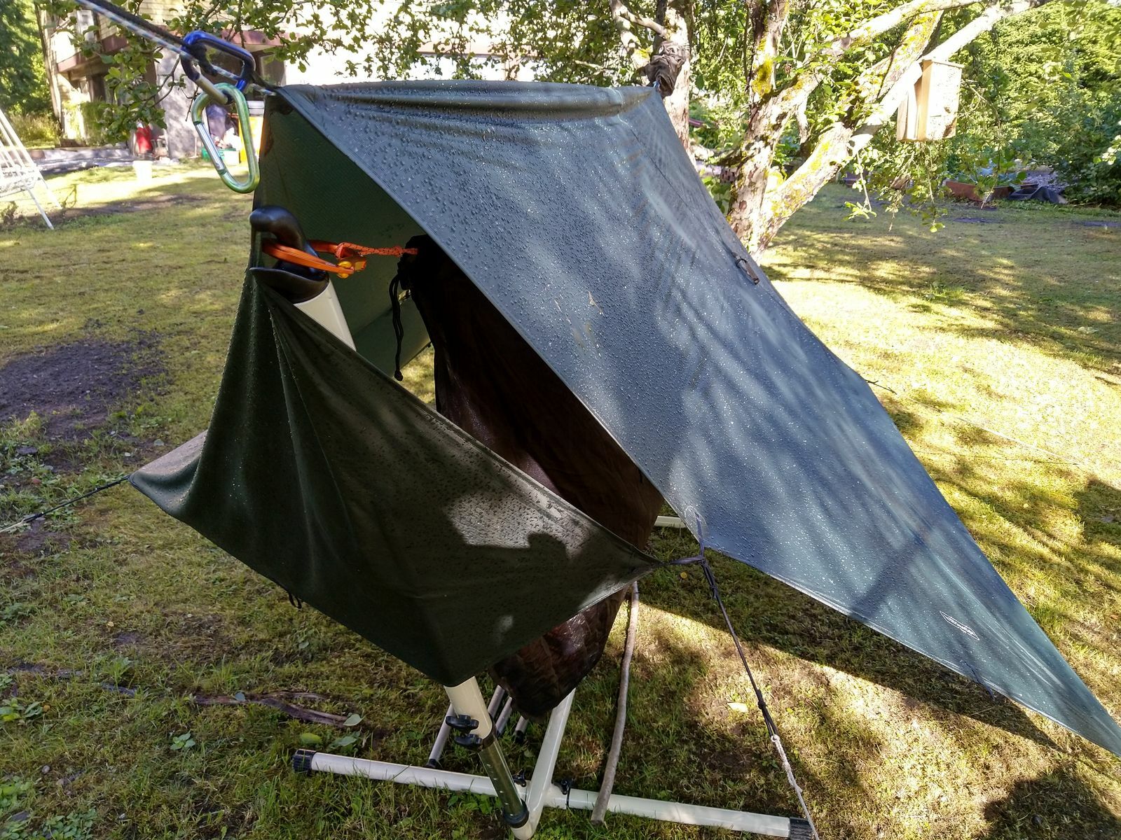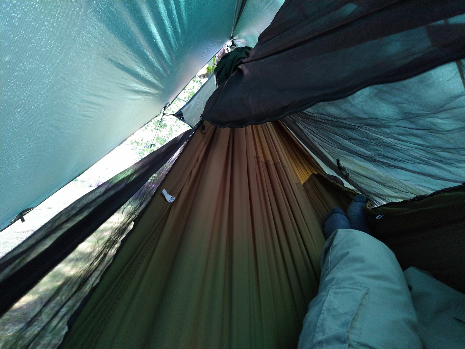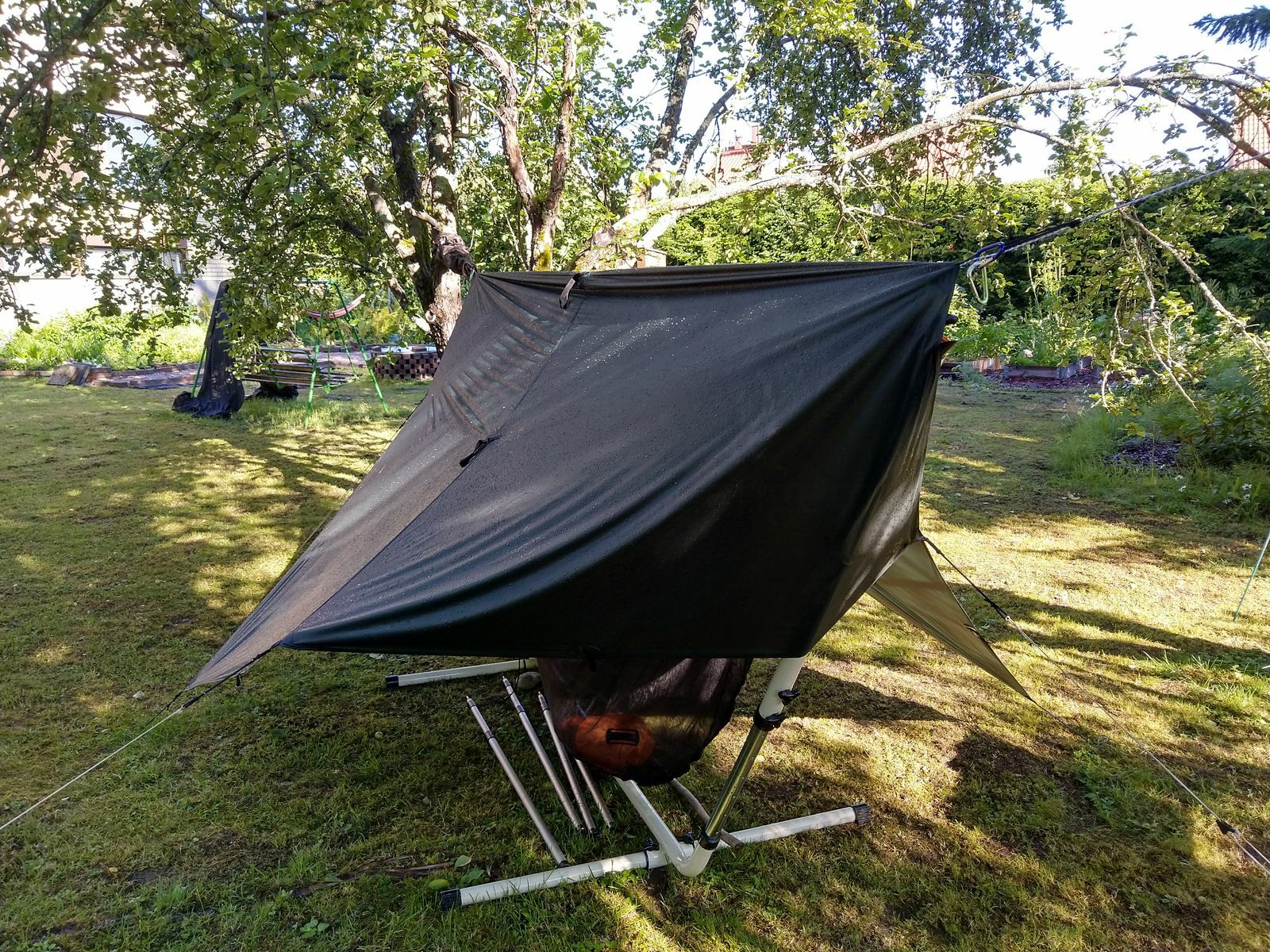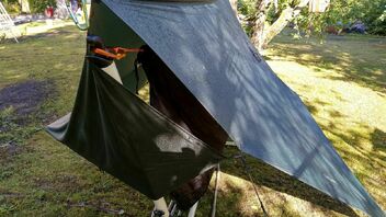 Hmm, beim vorherigen "Ausatmen-Drucktest" durch die jeweiligen Nylonstoffe war der Wannen-Nylonstoff durchlässiger also der 70d ripstopp meiner Hängematte. Und in der Nacht fühlte sich auch alles trocken und normal an.