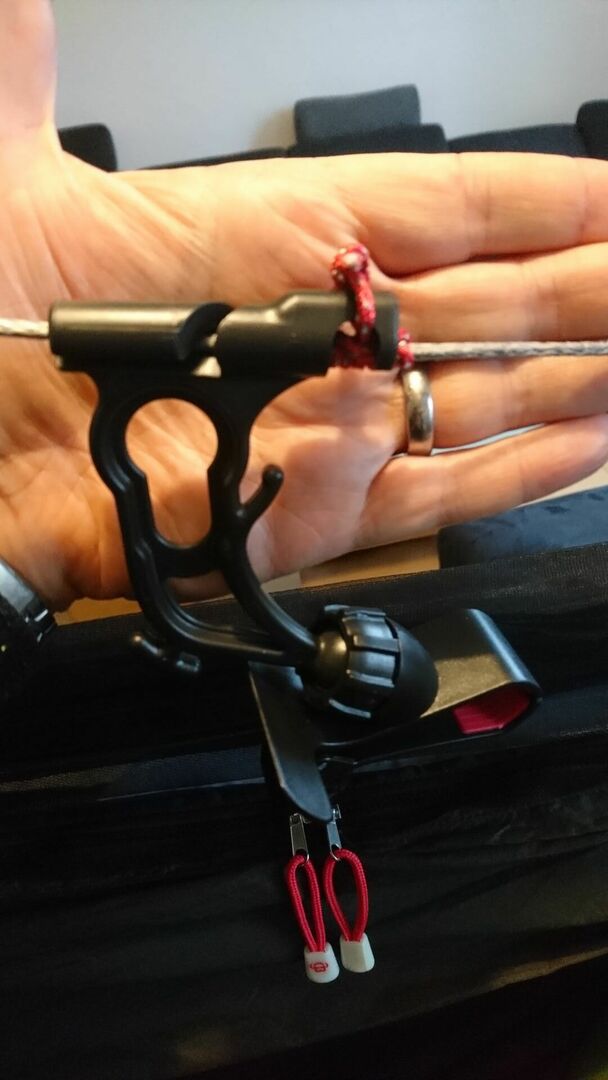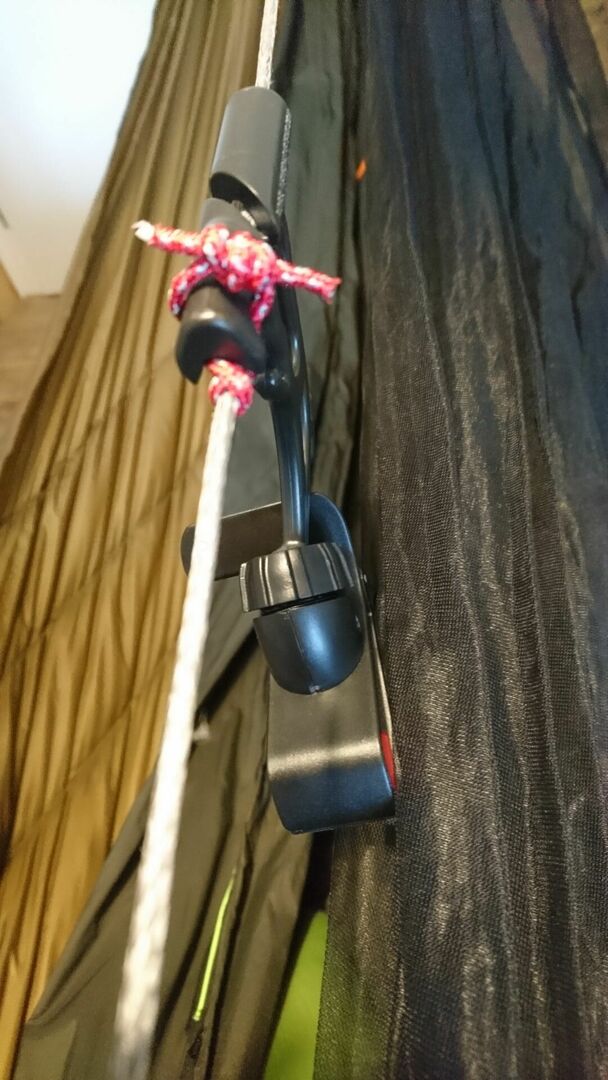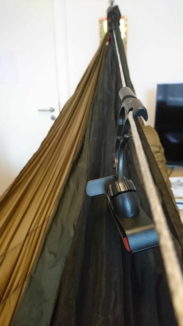 Ein Stück Schockcord als Loop eng um den Knubbel der HM gelegt und darein den Wooki mit original Aufhängung eingeklingt.... Höher bekomme ich den Wooki dann aber nicht...