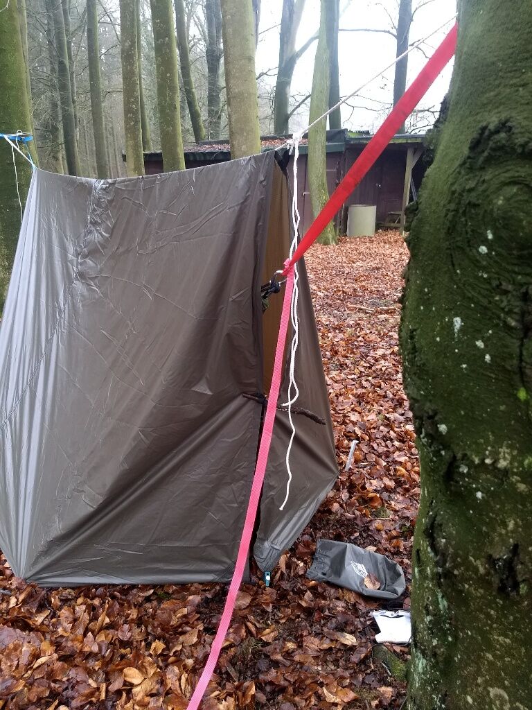 Ich habe ein 3*3 m Tarp, der beste Aufbau, für mich und den Hund war folgender.s. Bilder . Ich hätte das Tarp besser noch etwas anspannen können, sodass der Innenraum breiter ist.