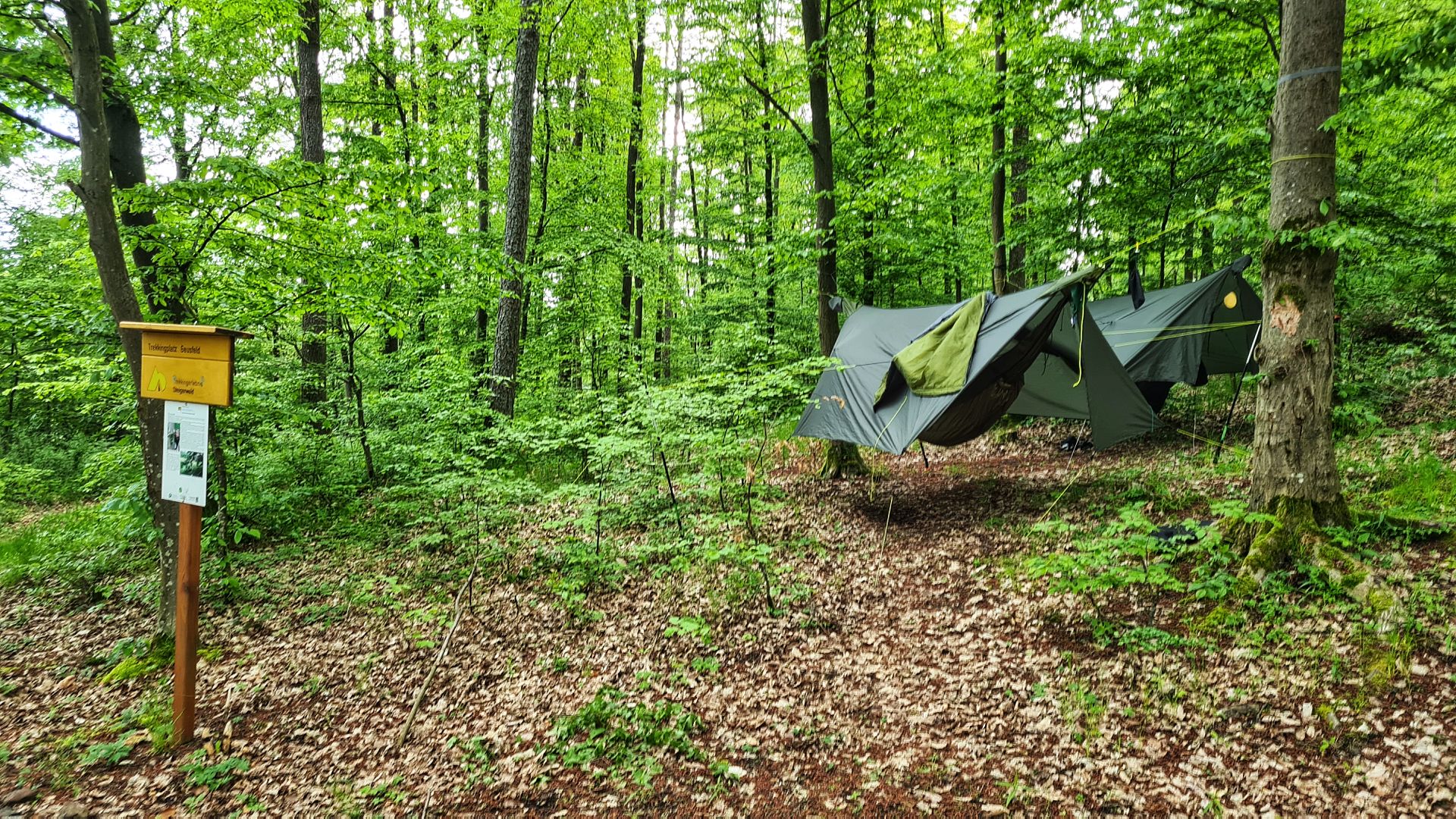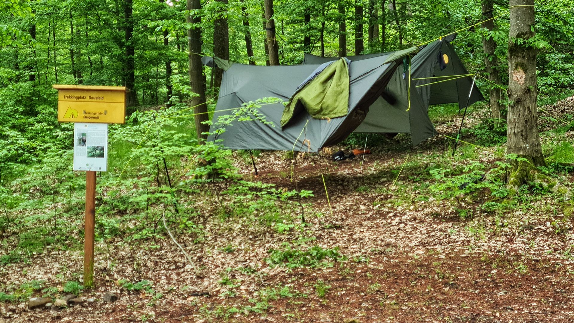 Auf allen Plätzen konnten wir problemlos mit zwei Hängematten hängen. Die Plätze sind nicht so versteckt, wie ich es vom Soonwaldsteig oder aus der Pfalz kenne. Da der Steigerwald recht einsam ist, war das aber kein Problem. Das Trekkingcamp Laubwiese liegt in Hörweite der Autobahn. Wir haben es trotzdem genutzt, um einen kurzen Weg zum Bahnhof für die Rückreise zu haben. Einen echten Reinfall hat es bei den Plätzen aber nicht gegeben.
