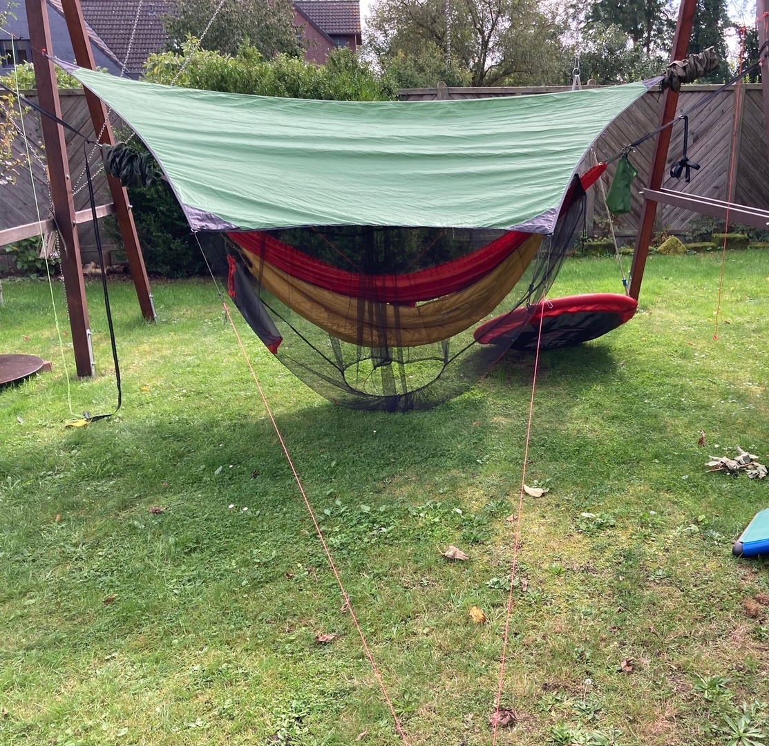 Ein Einteiler funktioniert natürlich auch, aber ich wollte sicher sein, dass mir der "Schwanz" nicht am Ende im Gesicht hängt. Bei der Konstruktion ist das überschüssige Seil immer an der selben Stelle und ausserhalb der Hängematte.