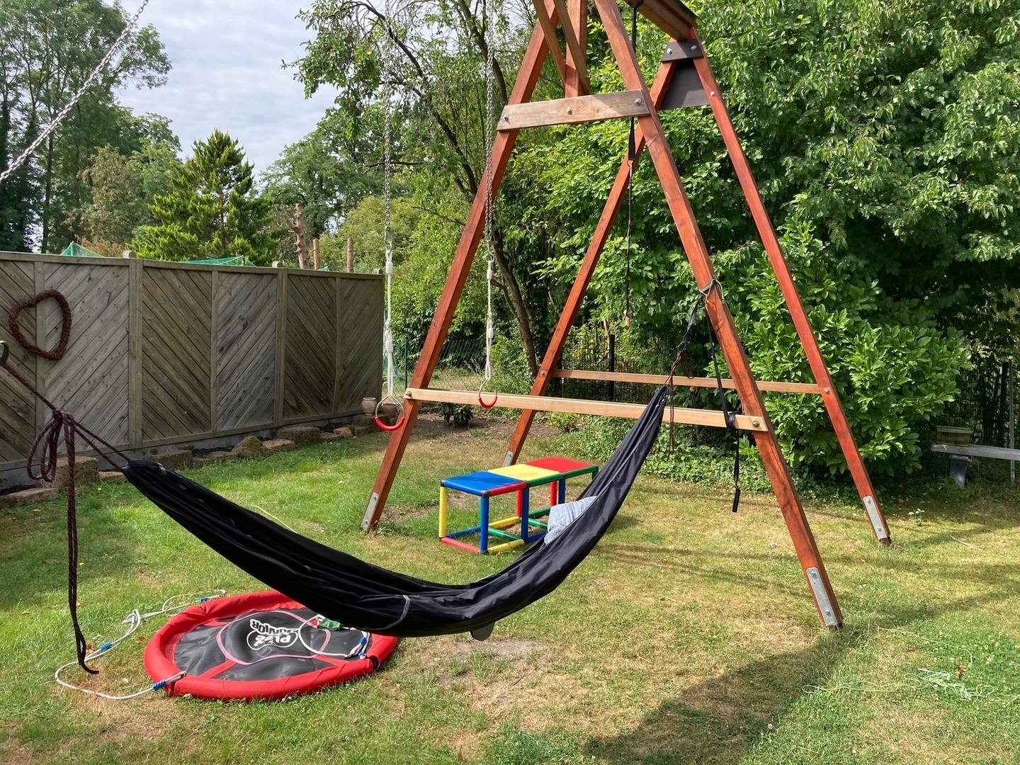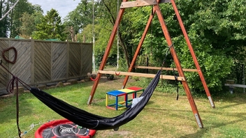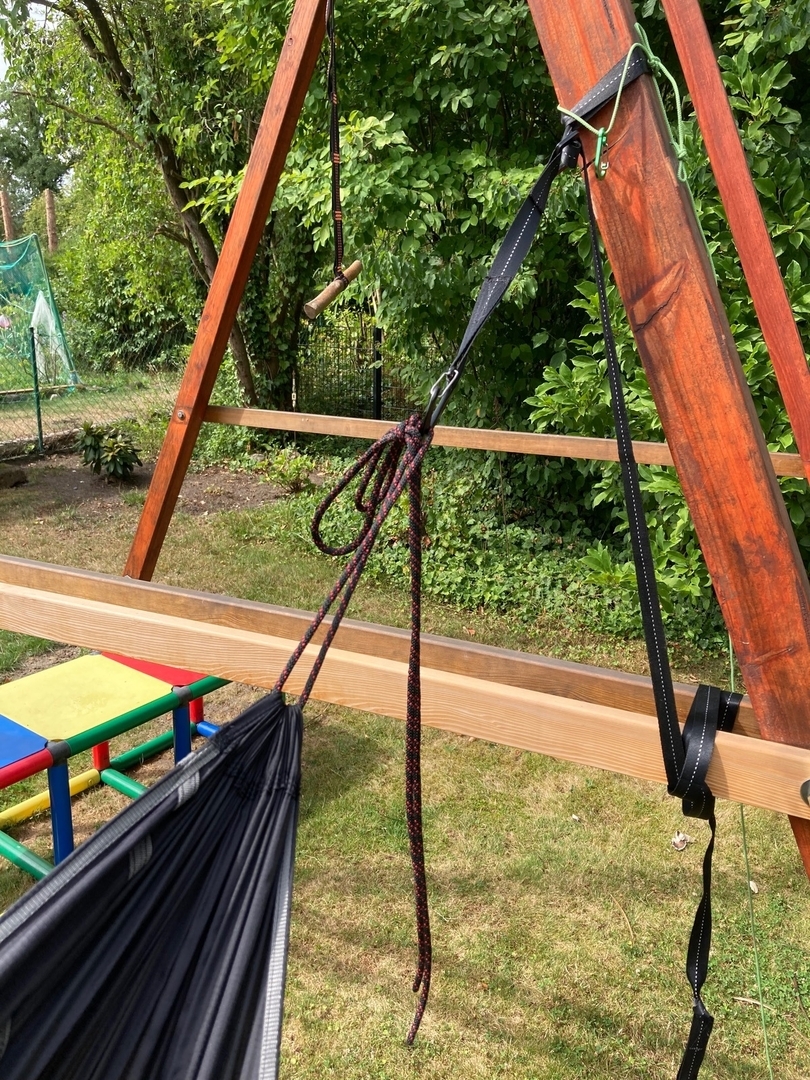 Als "Profi" fragt man sich, warum nicht zwei kleine Schlaufen verbaut werden, und als experimentierfreudiger Newbie wird man wahrscheinlich unsanft auf der Erde landen oder Schaden an Bäumen anrichten; eine Anleitung, was genau man machen soll, gibt es jedenfalls nicht. Ich habe die Seile erst einmal schnell verknotet, und dann mit einem verstellbaren Gurt verbunden — im Garten stört das überschüssige Seil nicht.