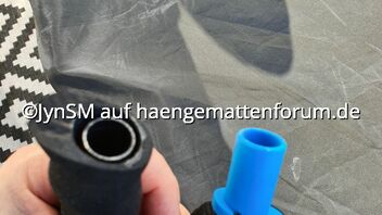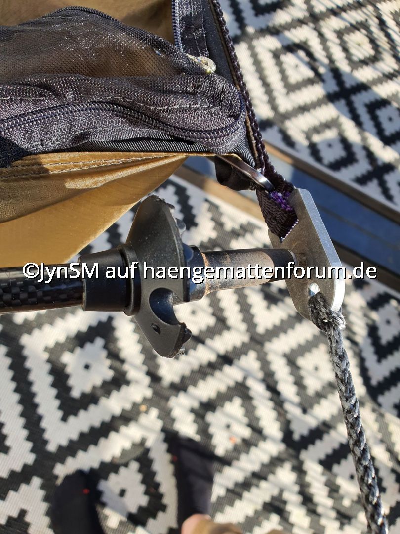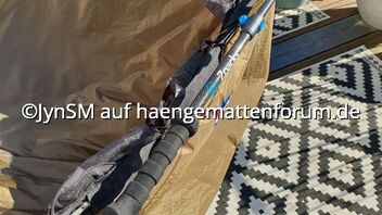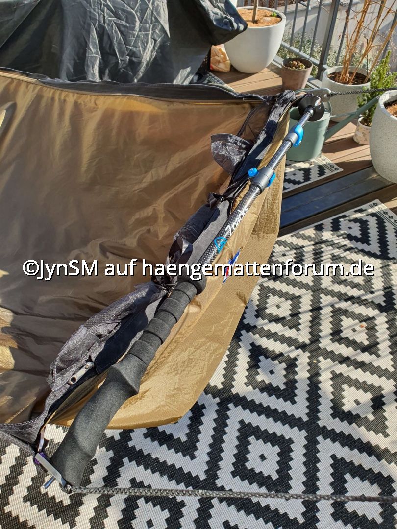Nicht so MYOG wie so vieles andere hier, aber vielleicht eine Gedankenanregung für andere. Basierend auf der Idee von Warbonnet konnte ich erfolgreich meine Zpacks Trekkingstöcke zu Spreader bars umbauen - ohne teuren Fotostativ-Stock und die Aufsätze von Warbonnet. Der Pin, der so schön in das Rohr der Stöcke passt, ist der von den mitgelieferten Aluminiumstangen, und die Spitzen der Stöcke sitzen schön fest in den Ösen der Hängematte.
