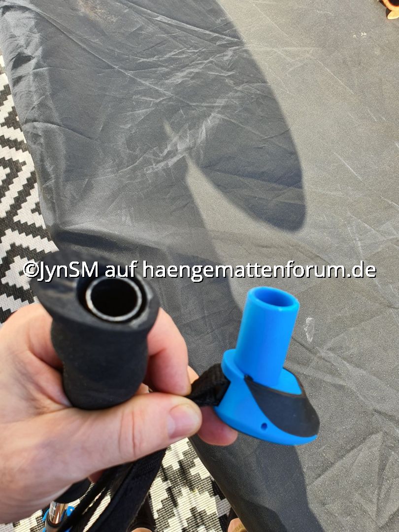Hält bislang bombastisch, werde aber wohl trotzdem noch entsprechende dünne kurze Holzstiele mit etwas geringerem Durchmesser als die Karbonröhren der Stöcke besorgen, die dann in die obersten Elemente der Stöcke passen und ggf einen Kollaps auffangen...