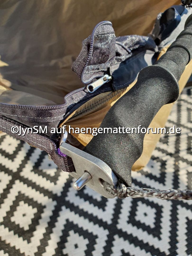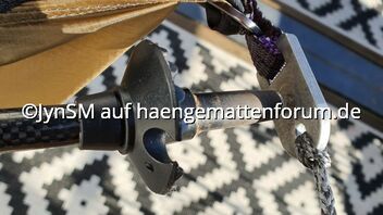 Es ist schwierig, das Problem nur an Hand der Fotos zu analysieren. Wenn du die Aufhängung ohnehin entsorgen würdest: schick mir doch einfach beide Whoopie Slings mit beiden Bridge Hammock Whoopie Hooks, und ich schicke dir neue Whoopie Slings mit eingespleißten Bridge Hammock Whoopie Hooks. Dann kann ich mir die Sache genauer anschauen und ggf. Feedback an Dutch weiter geben.