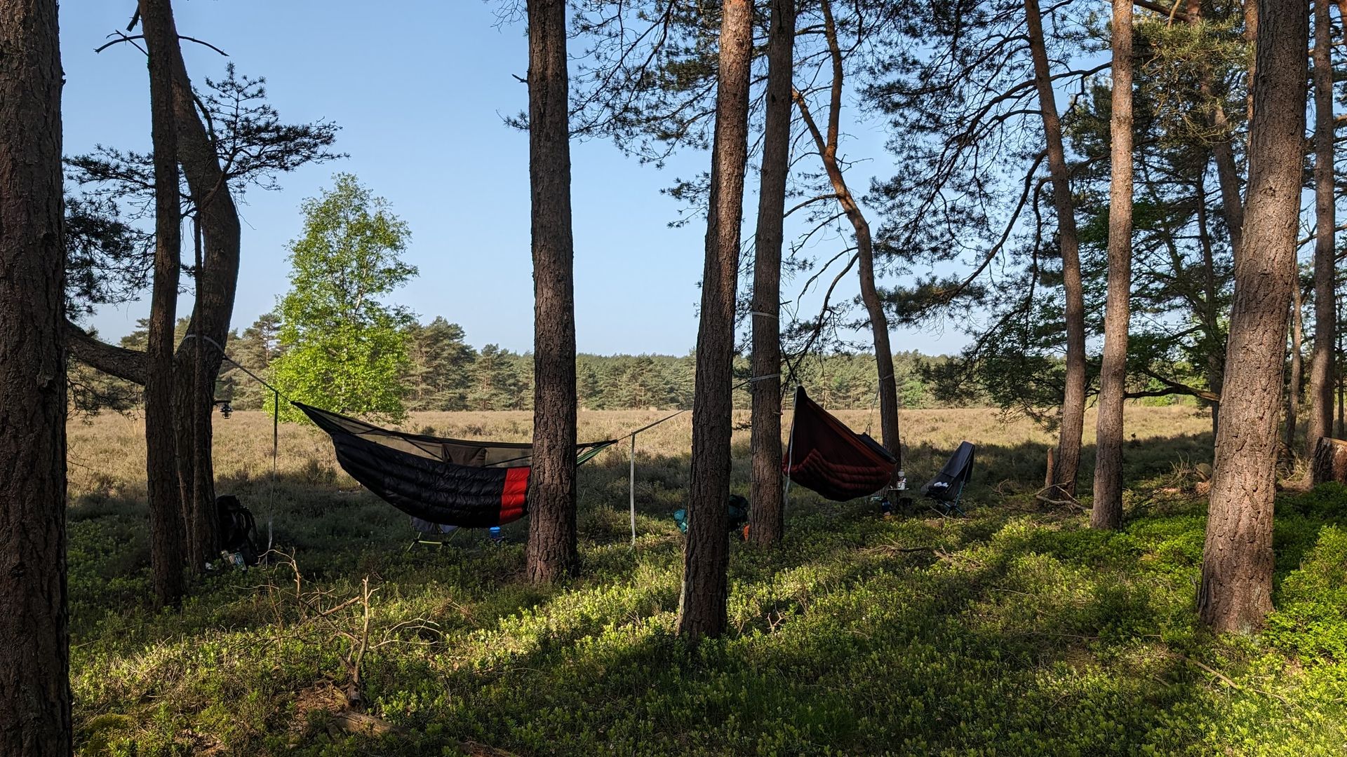 Der Plan sieht so aus, dass man den gemütlichen Teil der Hängerei entspannt im Hottent verbringt, vielleicht ein oder zwei Destillate schottischer Machart verkostet, verschiedenes Bratwerk bereitet und dann in den separat verspannten Hängematten nächtigt um morgens wieder im Zelt zu wärmen.