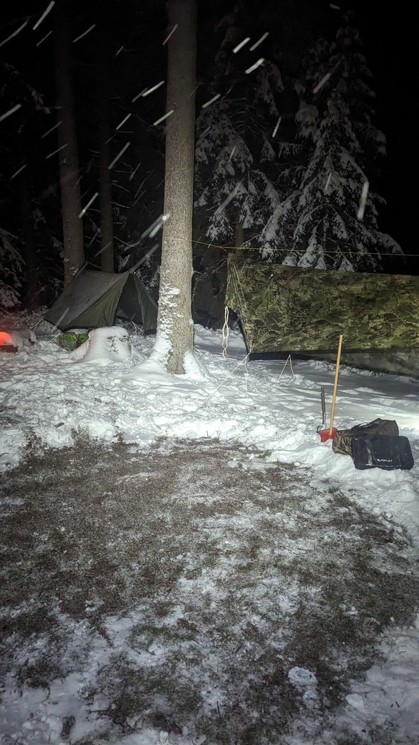 pedal-ritter und ich hatten noch eine Rechnung offen - mindestens einen Overnighter pro Monat in 2023. Januar bis November war drin, Dezember stand noch aus. Also haben wir just eine Stunde lang das Amazon Zustellfahrzeug gesucht, das unser brandneues Pomoly Hot Tent spazieren fuhr. Gegen 20 Uhr konnten wir dann aufbrechen und hatten um 12 rum alles aufgebaut - und da war noch kein Wein im Spiel!