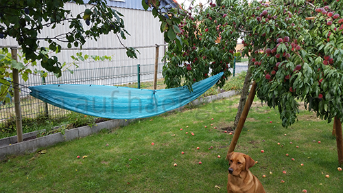 Auch praktisch für Leute ohne Aufhängung, dass alles an Zubehör bereits enthalten ist. Der Packbeutel ist fest mit der Hängematte verbunden.