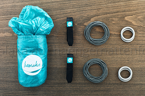 Das Set beinhaltet die Hängematte (235g), leicht elastische 2cm breite Tree-Straps (40g), 2x3,5m Meter Seil (50g), 4 Aluringe (45g) und ein Infoheftchen zur Hängematte. Ich habe nur die Tree-Straps und Ringe genutzt und sie mit Whoopies und Karabinern kombiniert.