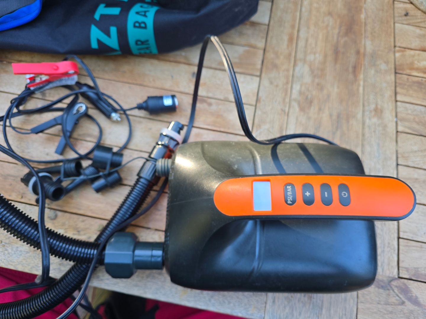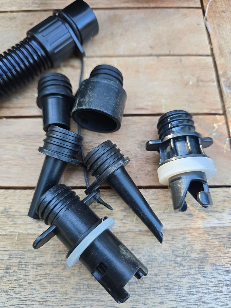 Das ist meine Pumpe samt Betrerieklemmadapter und Ventiladaptern. Der rechte, lose passt auf fast jedes SUP und vermutlich auch aufs gezeigte Packraft.