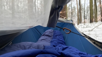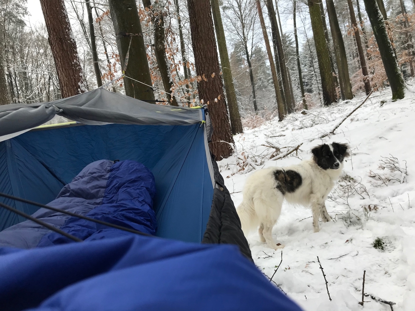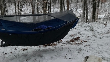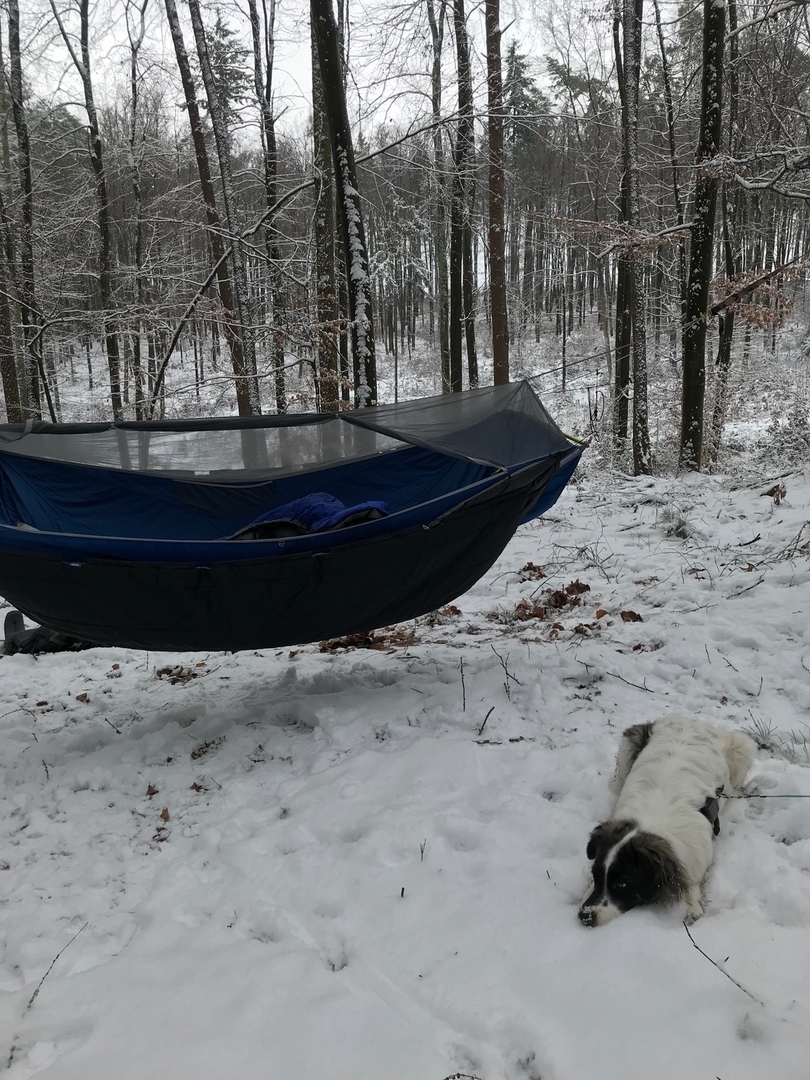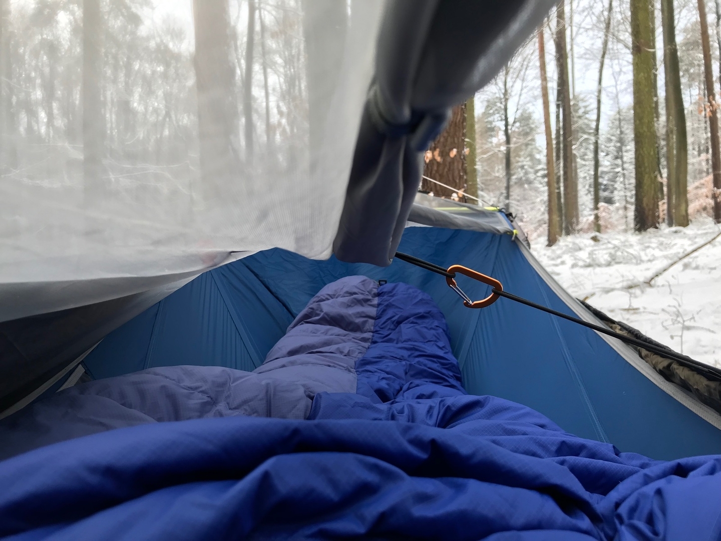 Fotos habe ich letzten Freitag bei ca. -5 bis -3 Grad Celsius gemacht. Mit zwei provisorisch angebrachten mitteldicken Underquilts drunter habe ich mich pudelwohl gefühlt.