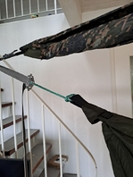 Ich habe die Lösung von Onewind übernommen, mit dem Kordelstopper kann man die aufgewickelte Leine blockieren/festmachen. Kann ich bei Gelegenheit ein Foto nachreichen.