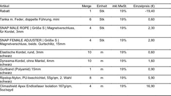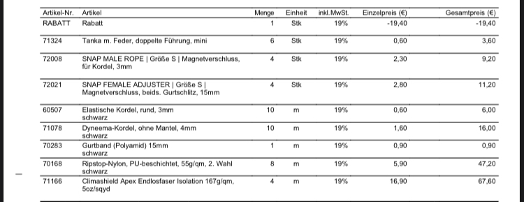 Ich möchte mir ein UQ nähen im Anhang sind meine Materialien die ich eingekauft habe. Passend zum meiner genähten 12 ft Hängematte siehe Bild. Geplant ist den UQ an den 4 Ecken mit Fidlock zu befestigen und an allen vier Seiten mit Gummizug zu versehen. Meine erster Gedanke war den UQ rechteckig zu nähen und den Rest per Gummizug anzupassen. Gerade denke ich ob es sinnvoll ist den UQ an den Enden schmaler zu schneidern damit am Fuß- und Kopfende weniger gerafft werden muss.