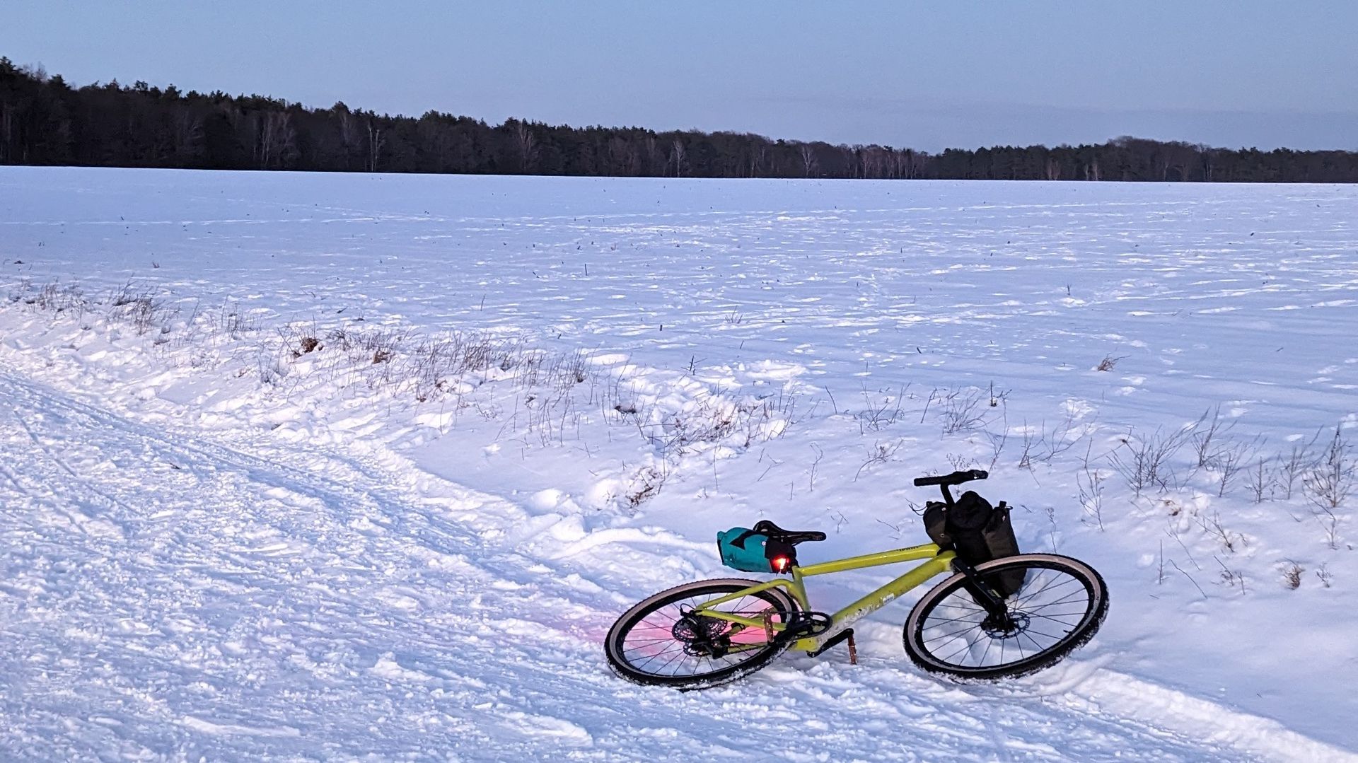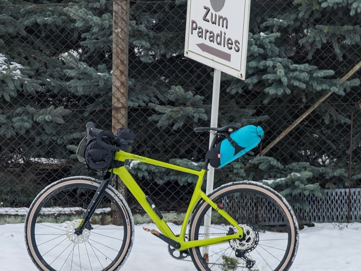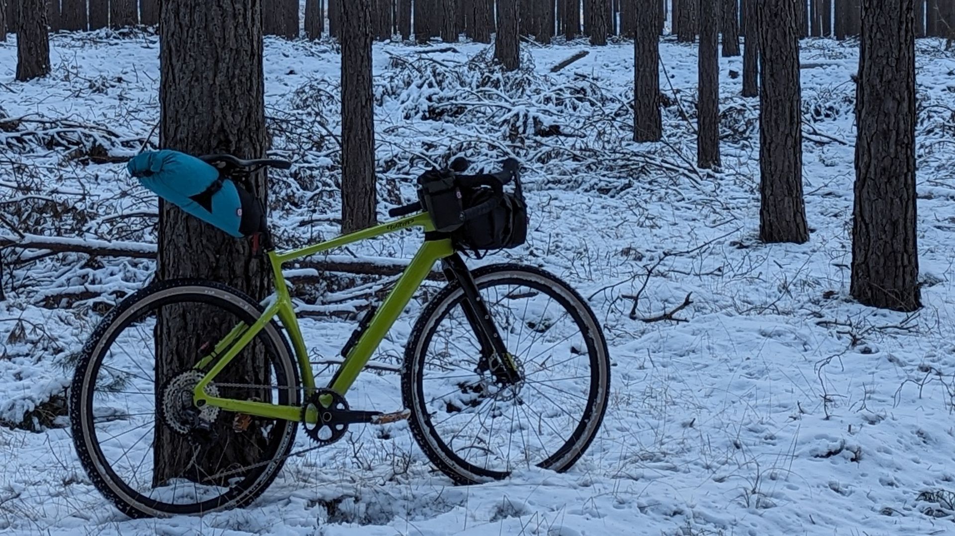 In der Lenkerrolle ist der Khibu Winter UQ und der Cumulus Quilt 250. Satteltasche etwas klamotten und die Warbonnet Eldorado. Hatte einen kleinen 18l Rucksack dabei, da war dann noch das Khibu Tricky Tarp drin.