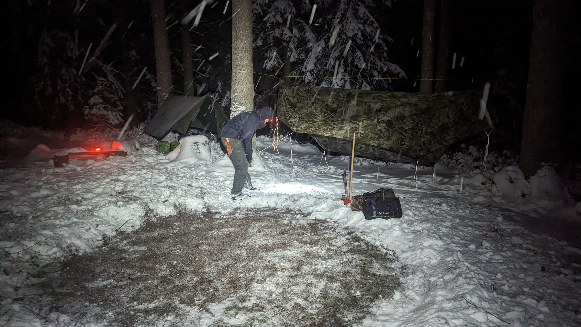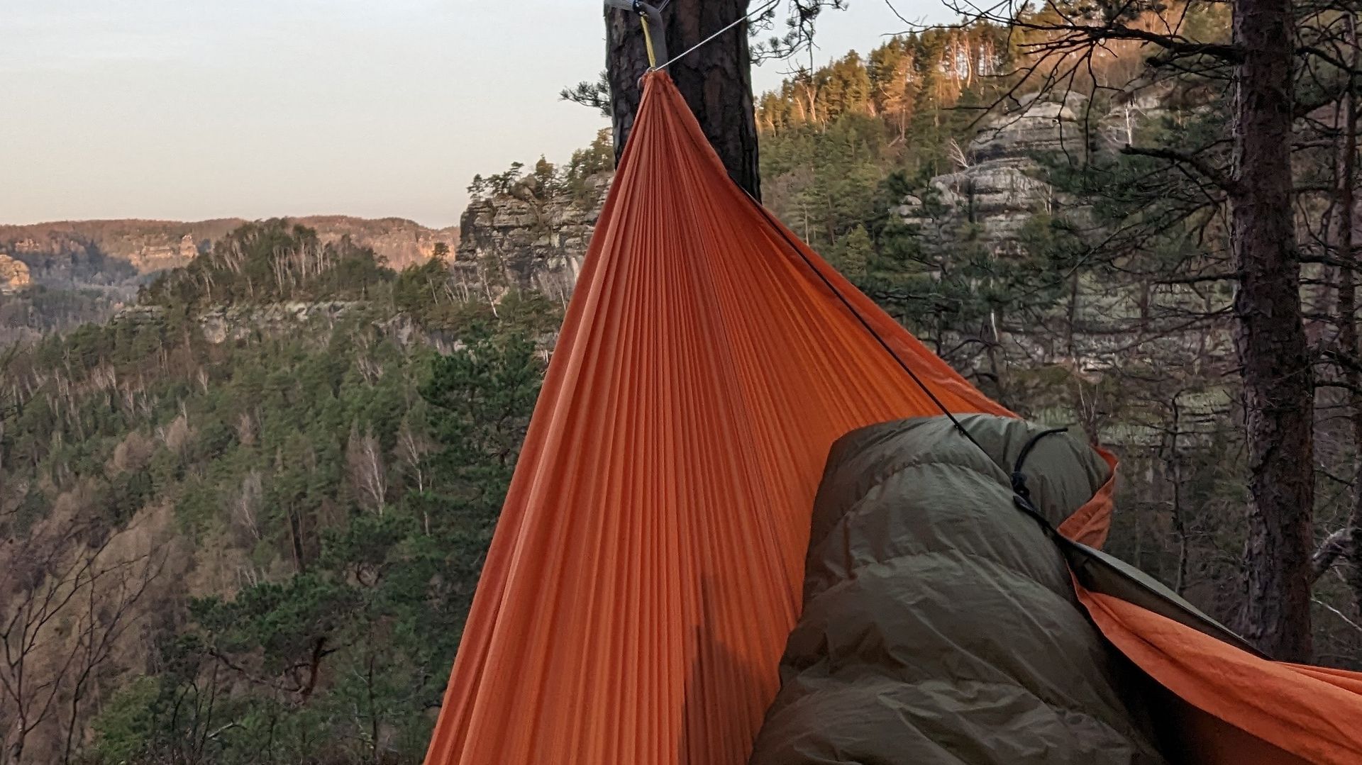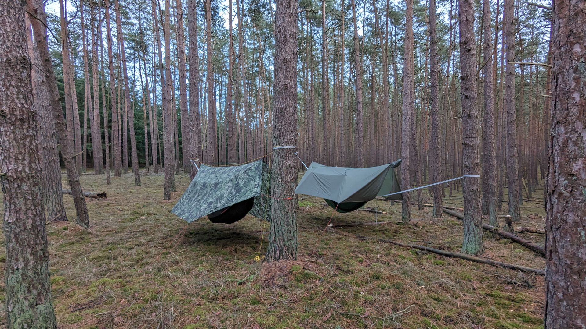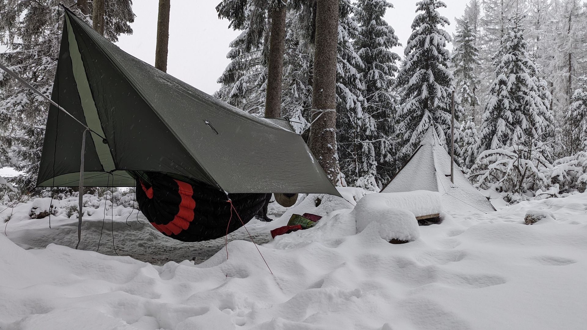 Der Plan sieht so aus, dass man den gemütlichen Teil der Hängerei entspannt im Hottent verbringt, vielleicht ein oder zwei Destillate schottischer Machart verkostet, verschiedenes Bratwerk bereitet und dann in den separat verspannten Hängematten nächtigt um morgens wieder im Zelt zu wärmen.