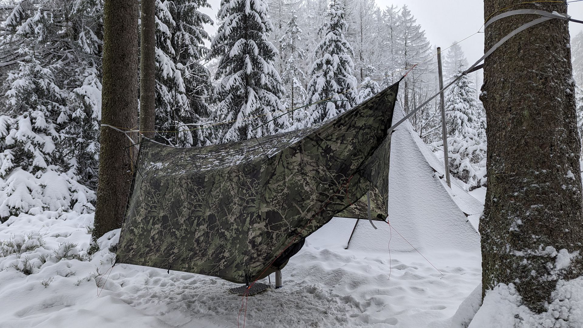 Es handelt sich dabei um das Tricky Tarp der Firma Khibu. Das Tarp verfügt über eine geteilte Ridgeline und Türen, die bei Bedarf geschlossen werden.