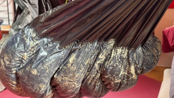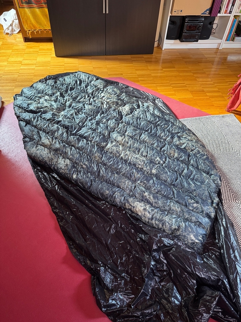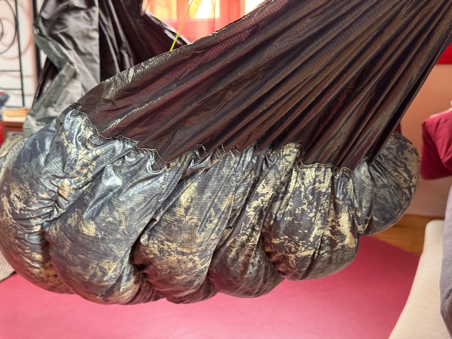 Länge und Breite am Kopf- bzw. Fussende habe ich aus der Grafik von short_handed_norseübernommen. Die genaue Position und den Winkel habe ich experimentell ermittelt. Ich habe mich in die Hängematte gelegt und dann von meinem Sohn die Mitte meines Körper mit Malerkrepp von unten auf der Hängematte markieren lassen. Bevor ich mich aber an die Daunenvariante gewagt habe, habe ich erst mal einen synthetischen Wooki (mit Apex) gemacht. Da konnte ich dann in Ruhe alles testen. Breite, Länge hat gepasst, auch der Winkel war gut, ich habe nur festgestellt, dass ich die isolierte Fläche etwas näher in Richtung Kopfende haben wollte. Diese Erfahrungen habe ich dann auf die Daunenvariante übertragen und jetzt passt alles perfekt.