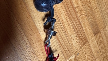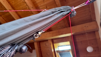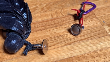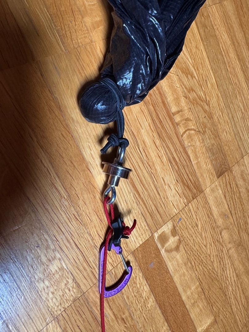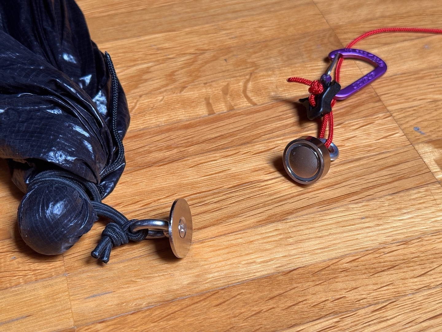 Deshalb habe ich nach einer Aufhängung gesucht, die im Notfall (falls ich mich in den Wooki anstelle in die Matte setzte) sich sicher löst und den Wooki unbeschädigt lässt. Das Whipping habe ich wie von Hammock Fairy hier beschriebengemacht. Allerdings hat mir die Aufhängung mit der Schlaufe und der Gummikordel (link) nicht so gefallen. Ich hatte immer das Gefühl, dass die Schlaufe entweder zu einfach über den Knubbel gerutscht ist, (bei leichtem Zug lag der Wooki am Boden) oder zu fest (ich habe mich nicht getraut stärker zu ziehen). Deshalb habe ich nach einer Alternative gesucht und mir eine magnetische Aufhängung gebastelt.