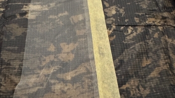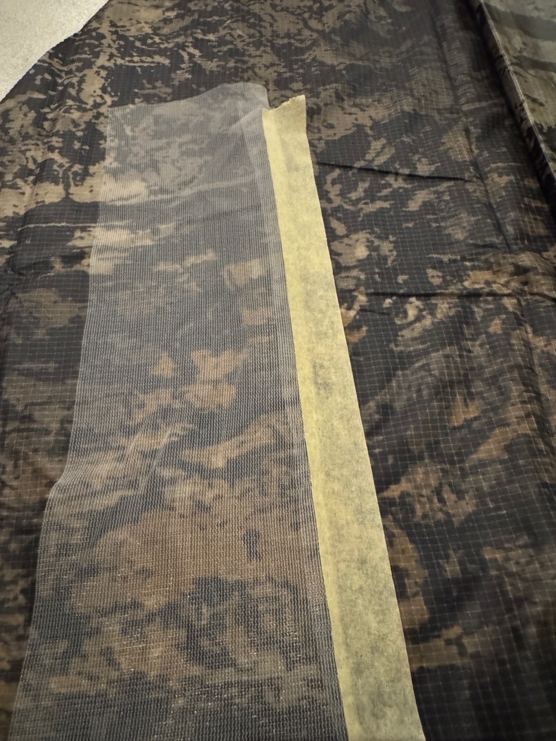 Das mit dem Kreppband sieht dann so aus: Da kann man jetzt relative einfach knapp links des Kreppbands den Baffle an den Stoff nähen.