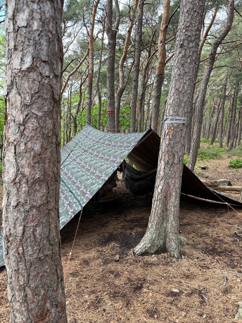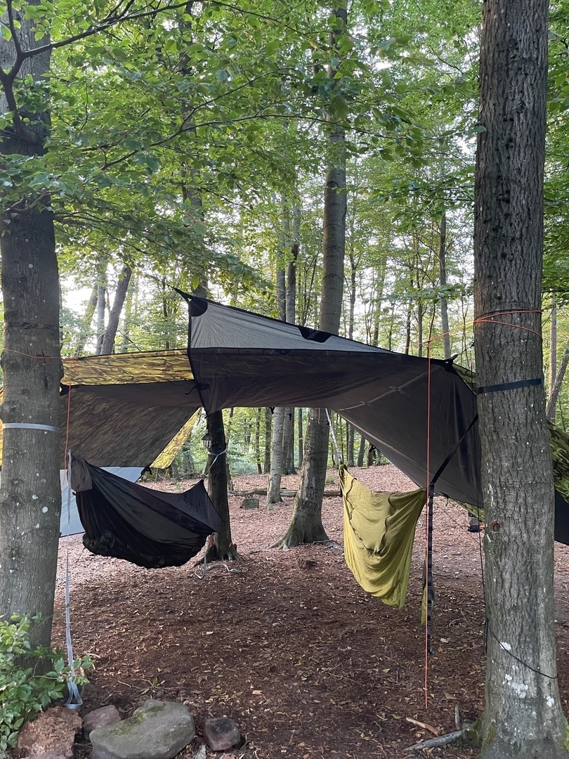 das war tatsächlich der allererste Versuch. Die beiden unteren Tarps hatten wir als Dreieck abgespannt... dann ein großes oben drüber... war dank Sturm und Starkregen binnen kurzem sehr ungemütlich...