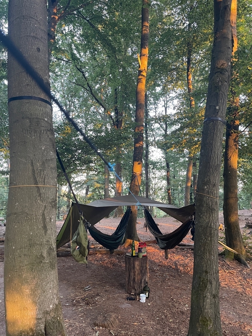 Der Plan sieht so aus, dass man den gemütlichen Teil der Hängerei entspannt im Hottent verbringt, vielleicht ein oder zwei Destillate schottischer Machart verkostet, verschiedenes Bratwerk bereitet und dann in den separat verspannten Hängematten nächtigt um morgens wieder im Zelt zu wärmen.