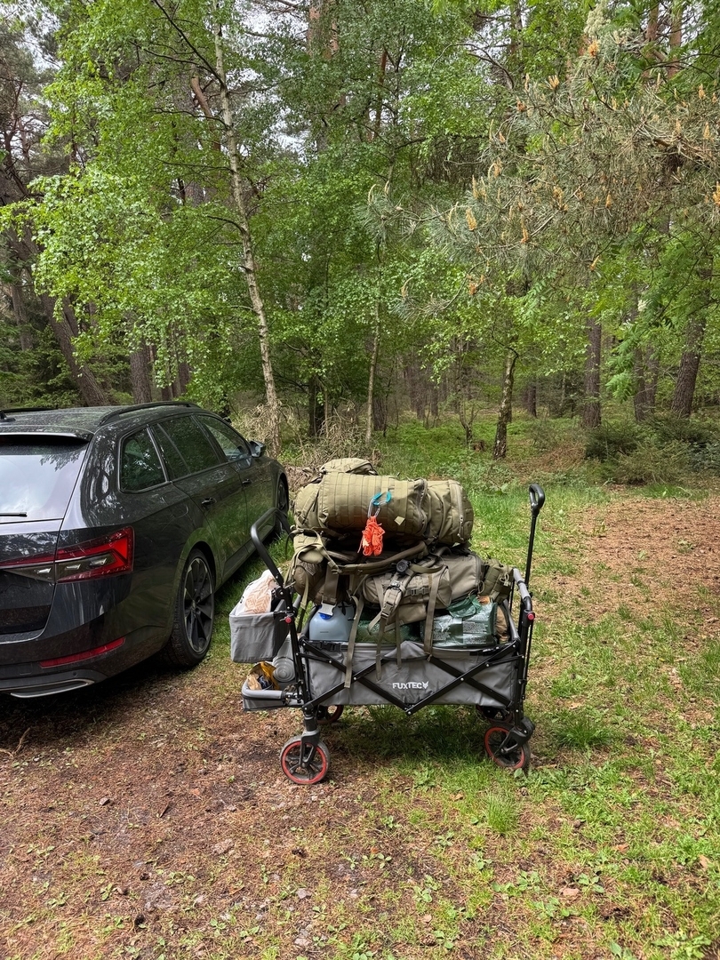Zunächst wieder mit dem berüchtigten Bollerwagen Säcke voller Holz in den Wald und den steilen Anstieg auf den Trekking-Platz schaffen und dann gings ans Aufbauen.