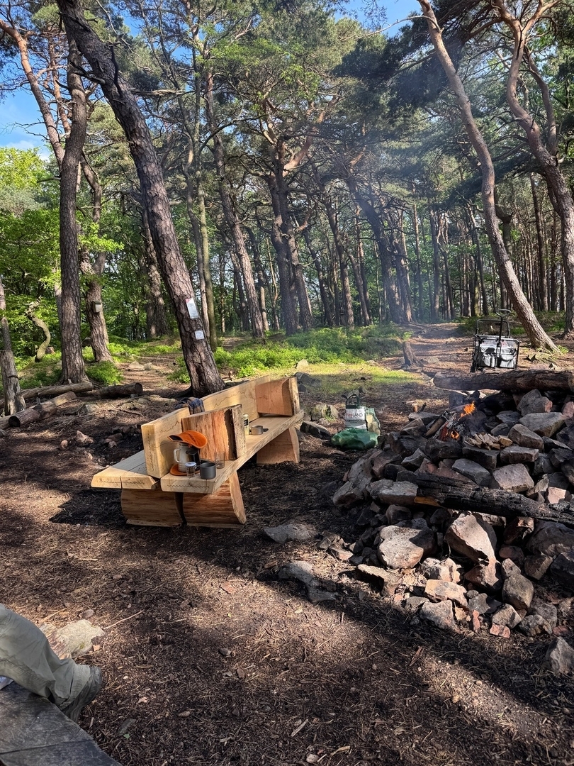 Jetzt hieß es für uns eine schöne Bank bauen, dann Feuer an und erstmal das Leben genießen.