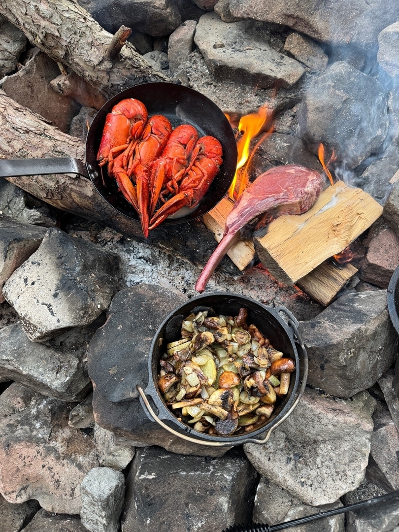 Und dann hieß es auch schon wieder Abendessen... Da die Kühlakkus meistens eh nicht bis zum zweiten Morgen halten, hatte ich mir mal etwas ausgedacht... Hummer werden ja in Deutschland gerne mal als Tiefkühlprodukte angeboten... das ist im Endeffekt ein Kilo Eis mit Hummer drin... also perfekt als Kühlakku fürs Wandern geeignet. Während die Dinger laaaaangsam auftauen, bleibt der Rest schön Kühl und wenn die aufgetaut sind, kann man sie einfach essen... übrig bleibt nur die Verpackung. Als Beilage dazu gab es noch ein Tomahawk Steak direkt aus dem Feuer und bisschen Bratkartoffeln und Pilzen und Zeug...