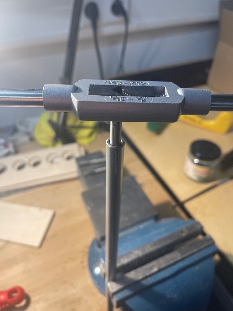 Bei den Rohren habe ich zwei verschiedene probiert... zuerst ein recht dünnes Stahlrohr mit 12mm Durchmesser und knapp unter 10mm Innendurchmesser, da ging aber kaum Gewinde rein und es erschien mir seeeeeehr "labberig". Das andere Rohr war auch 12mm außen und 8,5mm Innendurchmesser. Das Gewinde ist jetzt deutlich besser.