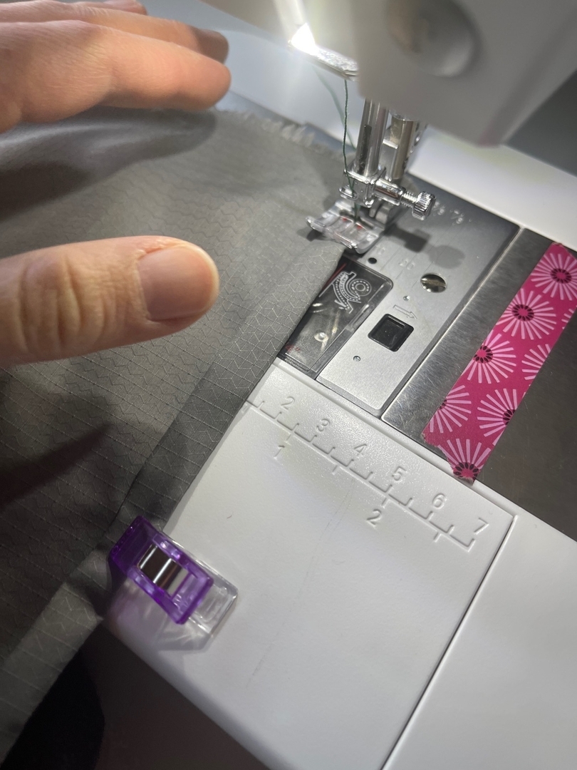 Ich habe mich grob an die Anleitung von Ripstopbytheroll gehalten und zunächst mit den beiden langen Seiten angefangen. Ein Hinweis meiner Frau war noch: erstmal die Seite Umbügeln, dann nähen. Die Idee fand ich erstmal gut, war mir aber nicht sicher, wie der Stoff auf die Hitze eines Bügeleisens reagiert. Aber auch hier: Es ist nur fürs Gear. Also langsam mit niedrigster Temperatur angefangen, nix... bisschen höher... nix... (also keine Bügelfalte) wieder bisschen höher und so Weiter und so Weiter, bis ich irgendwann eine Falte eingebügelt hatte... Da ich allerdings vor hatte das Ganze 2x umzufalten, hätte ich jede Seite 2x Bügeln müssen, was allein bei der Gear Hängematte 5,6m Bügeln nur für die Seiten gewesen wäre... Das war mir dann zu doof und ich hab mich für die Klipse meiner Frau entschieden. 2x umfalten, abklipsen fertig. Nachdem ich die Tücken im Umgang mit der Nähmaschine irgendwann auch in den Griff bekommen hatte, konnte ich bei meiner zweiten Naht auf der langen Seite sogar die Geschwindigkeit hochstellen