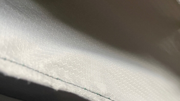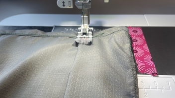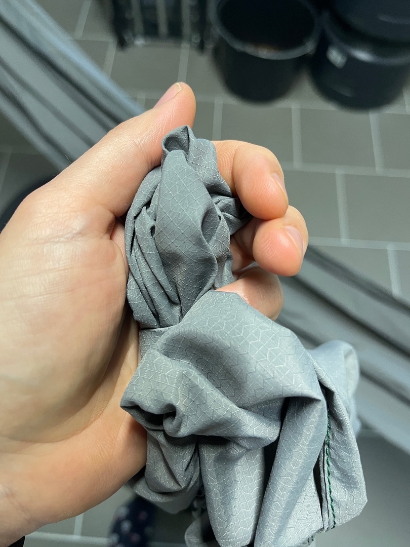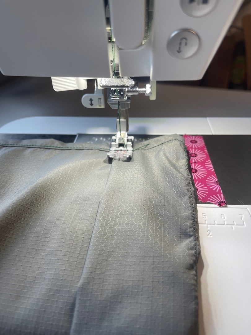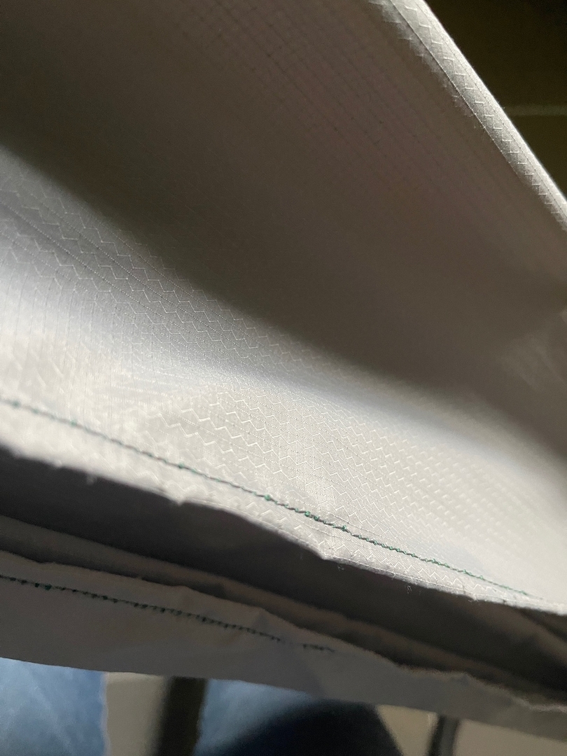 Solang die Faltung des Stoffes gleich bliebe, mussten ja auch die Nähte und Abstände und damit auch die Position der Nähte gleich bleiben. Das hat auch sehr gut funktioniert. Auch muss ich sagen, dass sich der Stoff (Airwave Ripstop Nylon siehe Oben) richtig gut vernähen ließ. Einzig beim Rückwärtsnähen war es etwas fummelig, aber es ging trotzdem recht gut. Das Vernähen der kurzen Seiten hab ich dann hier auch ohne die extra Naht gemacht, also 2x falten und abnähen.
