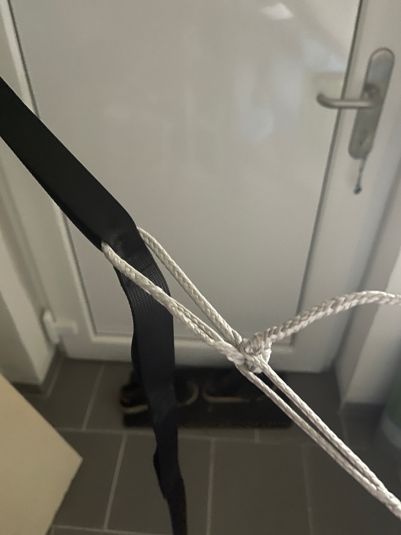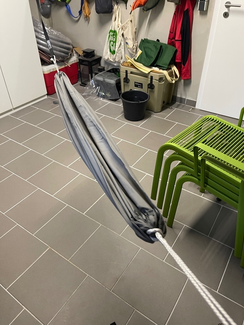 Im Ridgeline Calculator https://theultimatehang.com/hammock-hang-calculator/ kam ich bei einer Länge der Matte von 3,83m inklusive Aufhängung auf eine Länge der Ridgeline von 3,15m. Fun fact: Rechnet man auf der Website in Fuß, dann kommt ein anderer Wert für die Ridgeline raus, als wenn man in Metern rechnet... signifikant anders und zwar 2,59m als Ridgeline wenn man in Meter rechnet und 3,15m, wenn man alle Eingaben in Fuß eingibt und dann das Ergebnis umrechnet. Da sowohl für die eine, als auch die andere Länge genug Amsteel übrig war, entschloss ich mich für die 3,15m. Auf der einen Seite wurde ein fixed loop gespleißt und der dann eingehängt. Von dort aus entschloss ich mich zunächst offen ans andere Ende der Matte zu gehen, abzumessen und dann den fixed loop hier auch zu spleißen. Aber bevor ich den zweiten loop spleiße probier ich lieber nochmal aus, ob es grob passt. Also Knoten in die Ridgeline und oben eingehängt, reingelegt und gedacht hey total bequem... huch... toll, wie sich der Kellerfußboden sanft schlagartig an meinen Rücken schmiegt...