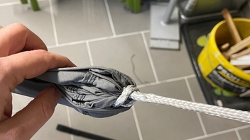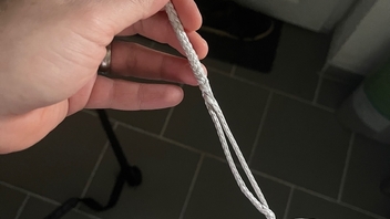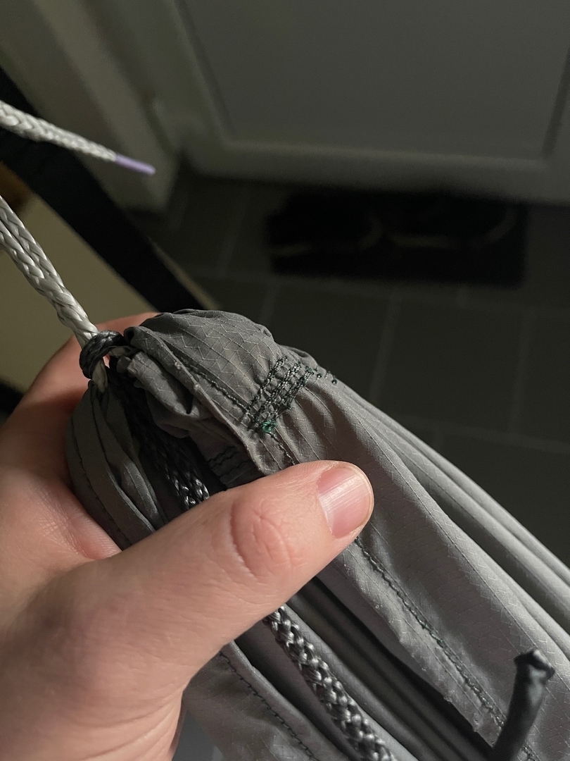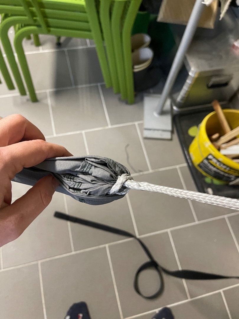 Hier hat sich dann herausgestellt, dass eine der beiden Seiten des langen Stoffstücks wohl nicht optimal abgeschnitten war... Als ich die Maße der Hängematte dann kontrolliert habe stellte sich heraus, dass ich nicht mehr 3,76m übrig hatte, sondern an der kürzeren Seite 3,73 und an der längeren Seite 3,81m übrig hatte... Aus einem Grund, den ich jetzt nicht mehr so 100% auf die Kette bekomme hab ich mich dazu entschieden, dass ich die Matte dann nicht auf 3,66m (12") sondern 3,63m (11,91") abzulängen. Als das fertig war, ging es daran, die Aufhängung zu einzufädeln. Zunächst hab ich (wie in der Videoanleitung erwähnt) das mitgelieferte 7/64 Amsteel durchgefädelt und verknotet. Das kam mir recht "rutschig" vor, aber wenn die Anleitung das so will... wer bin ich, dass ich mich darüber hinwegsetze... Da dem Kit knapp 5m Amsteel bei lag, wollte ich die Gelegenheit nutzen und mir direkt die Ridgeline mit anbringen.