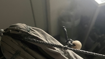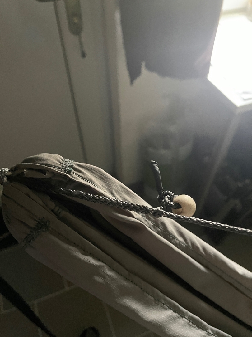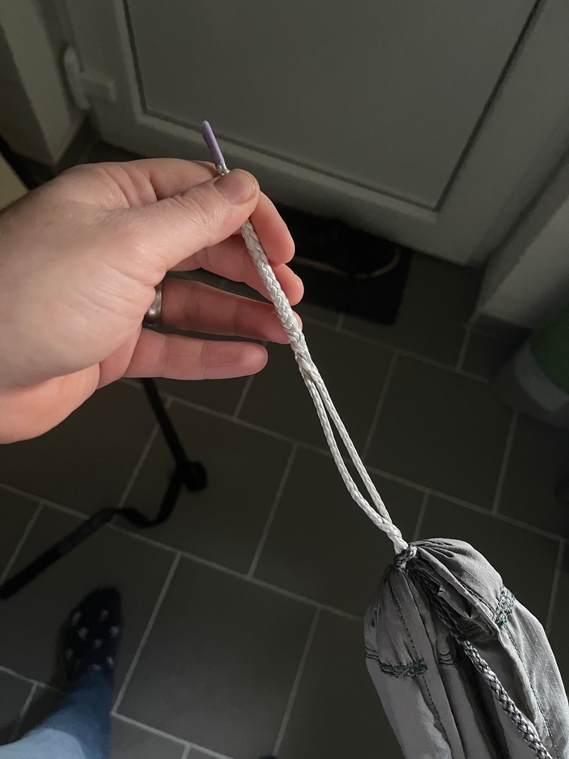 Die Ridgeline wurde dann eingehängt und auch hier mit einem gespleißten Auge und einem Burry versehen. Hier war aber leider (für meinen Geschmack zumindest) zu wenig Amsteel übrig, also entschloss ich mich nach ca. 5cm wieder aus der Ridgeline rauszugehen und eine kleine Holzperle einzuarbeiten... Diese würde sich nicht durchziehen lassen und mir vielleicht vor dem Versagen der Ridgeline einen sacht perlenden Hinweis geben. Als das auf beiden Seiten geschafft war, hieß es vorsichtig ausprobieren. Also wieder in den Keller und Hängematte aufhängen. Beide Enden so, dass bei erneutem Versagen der Weg zum Boden nicht ganz so weit ist und auf in die Matte.