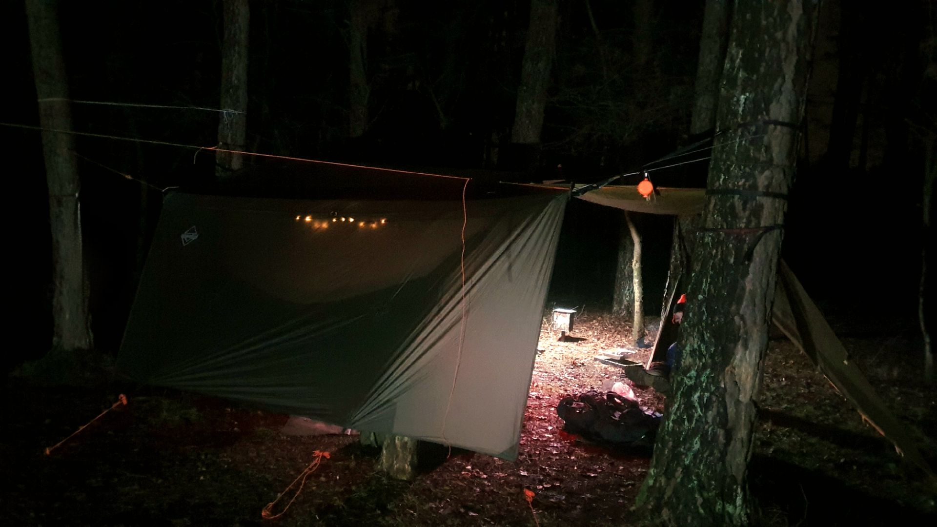 Wir hatten Glück und haben einen leeren Stellplatz im Waldstück hinten nehmen dürfen. Auf der normalen Zeltwiese waren auch Bäume(siehe Bildern->Homepage) allerdings mit relativ großem Abstand und der Wind Pfiff ordentlich.Da meine beiden Mitstreiter Hammocks unter 3m haben und uns allen das mit dem Wind nicht so passte hatten wir Glück das dort hinten noch viel frei war. Ich denke aber gerade in der Winterzeit und wenn mann nicht zwanghaft riesen Shelter baut, findet man auf dem Platz immer ein hübsches Pärchen.