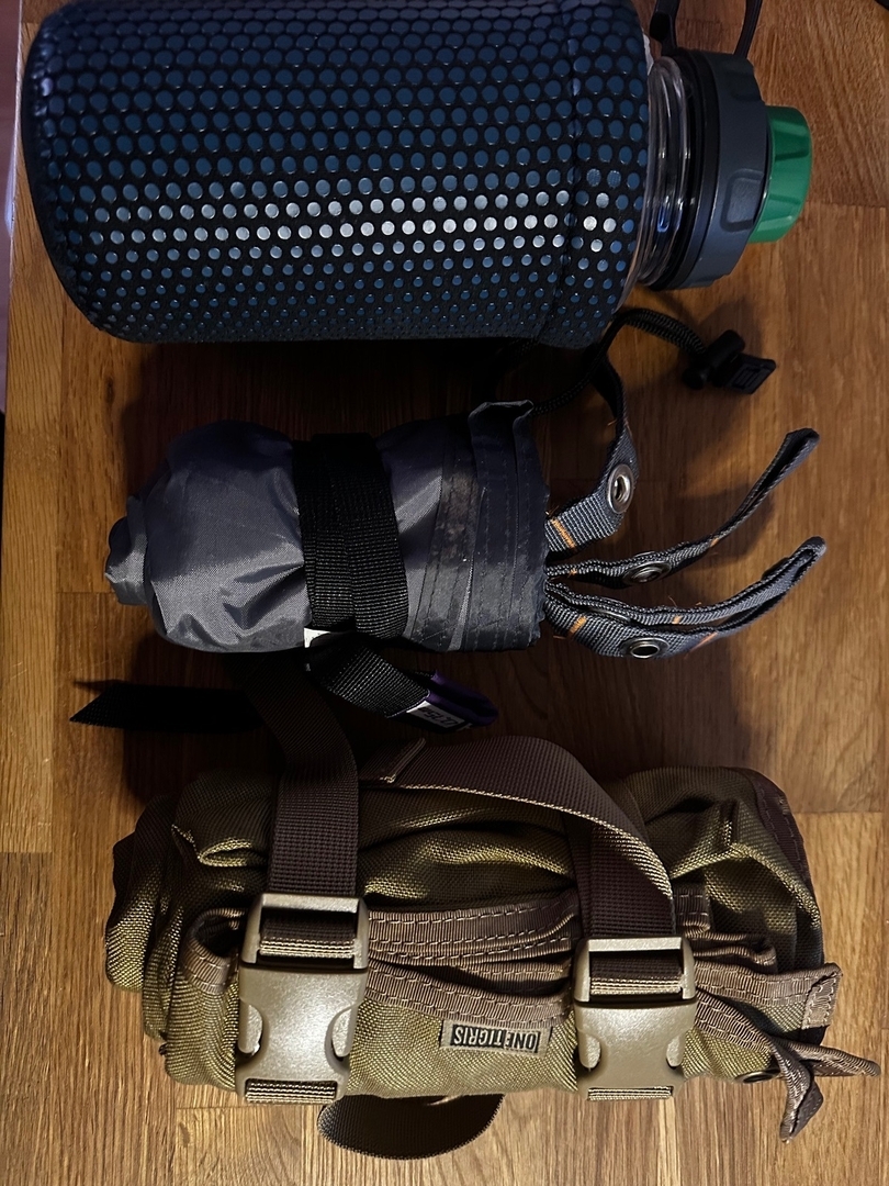 Entweder die one Tigris schiessmatte (cordura wasserabweisend) oder als etwas leichtere Variante ein etwa gleich großes und wasserdichtes groundsheet. Die lege ich unter die Matte. Beide etwas überdimensioniert für nur die Schuhe, ich packe da aber auch den Rucksack und alles was ich aus dem Rucksack auspacke drauf.