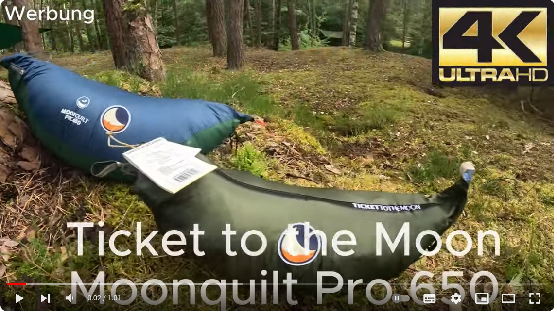 TTTM Moonquilt Pro 650Produktvorstellung: Ticket to the Moon Moonquilt Pro 650hydrophobe Entendaune, 650 Fill, 280g Daune210x135cm, 740gkommt mit Kompressions-Moonbag UND Aufbewah...www.youtube.comhttps://www.youtube.com/watch?v=uYayii0rN4s