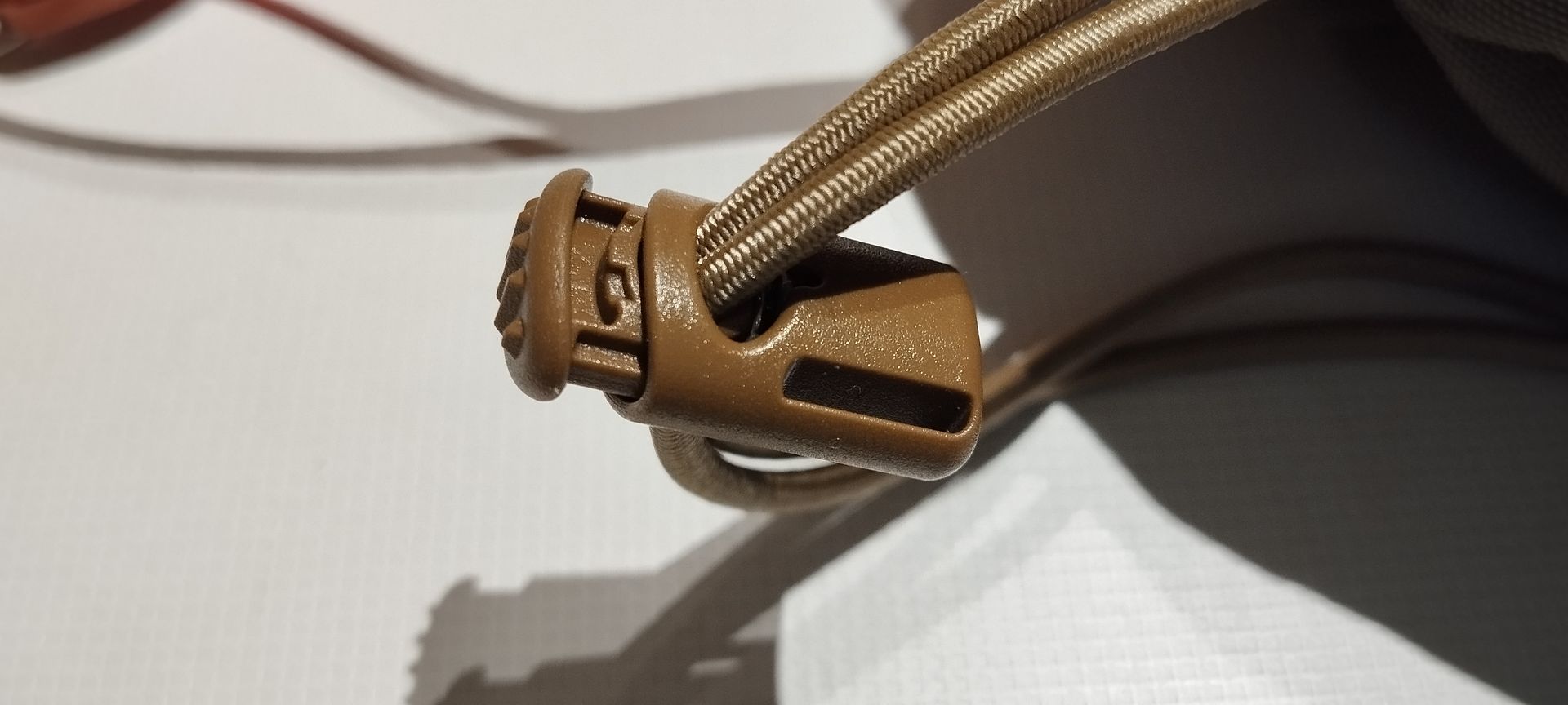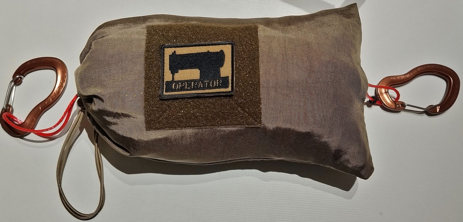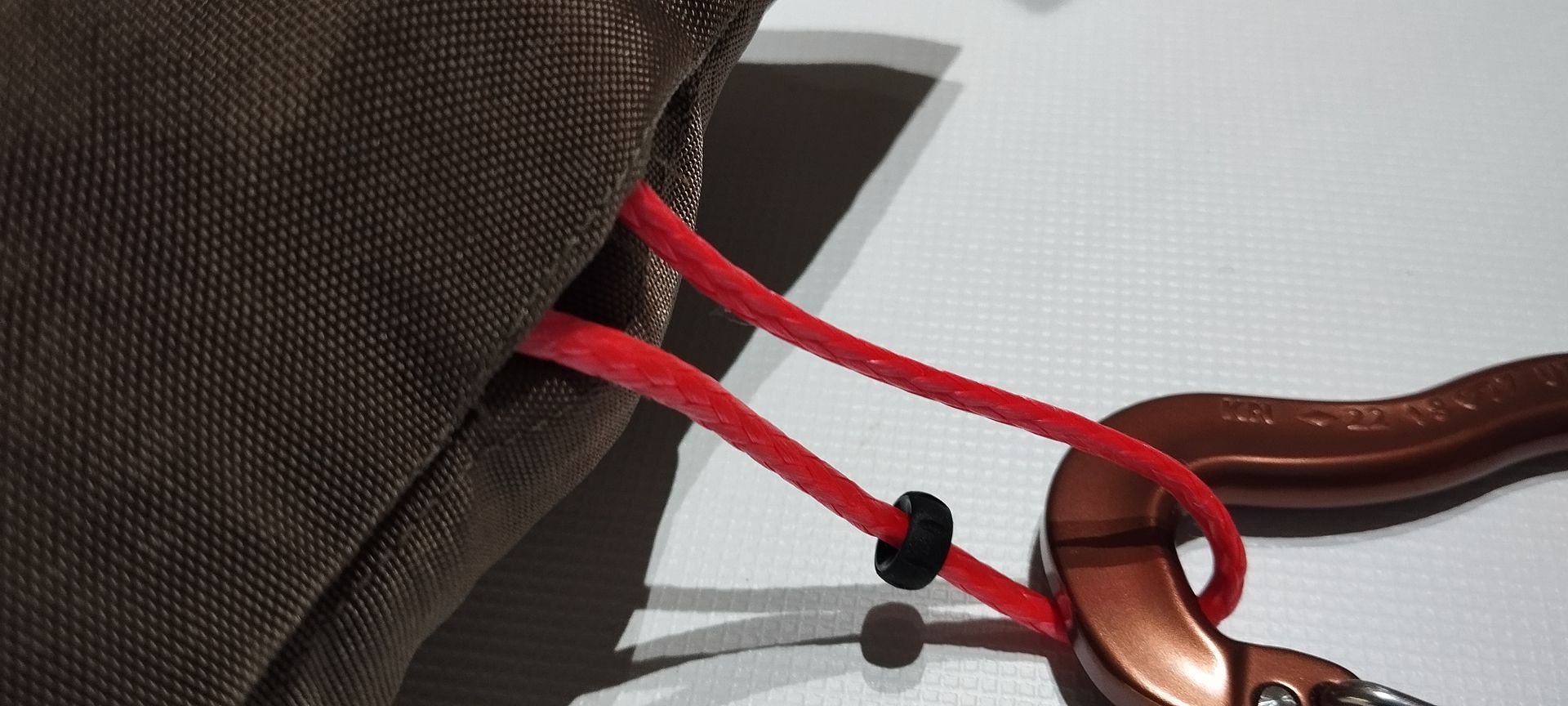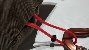 Kordelzug mit Shockcord und ITW Kordelstopper. Die Hängematte kann darin gut trocknen.2x Austrialpin MICRO Wiregate 22kN Karabiner braun eloxiert