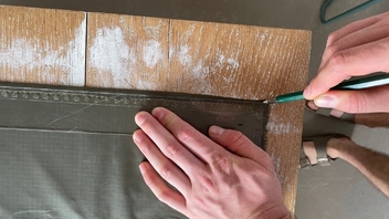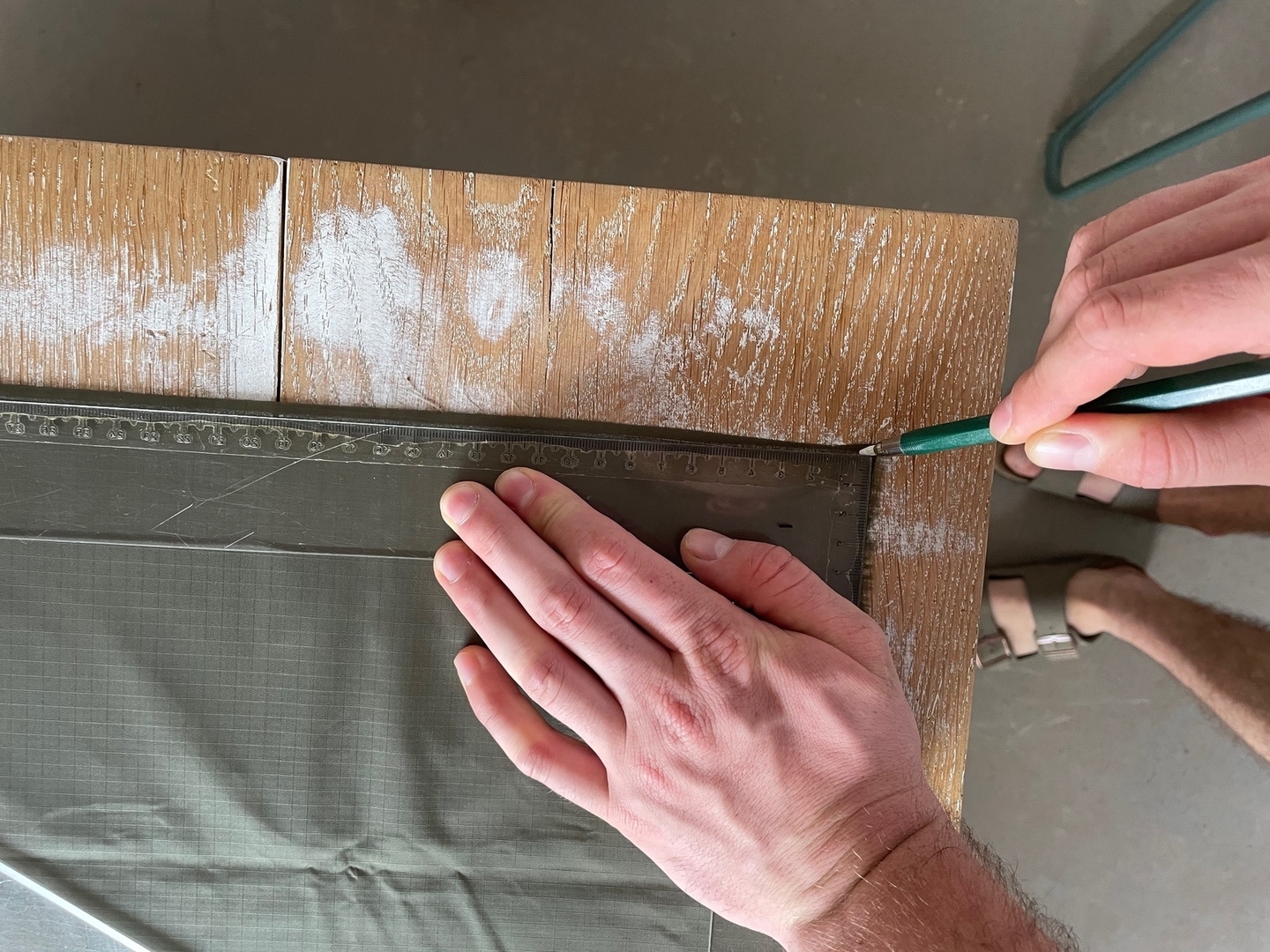 Es folgt das Umschlagen des Stoffes. Es ist gar nicht so leicht, eine gerade Linie zu ziehen. Doppelter Umschlag (-2 cm pro Seite).