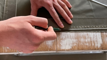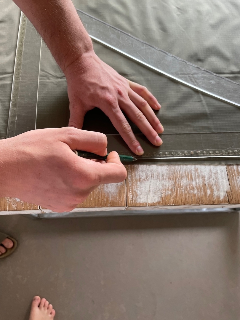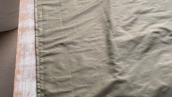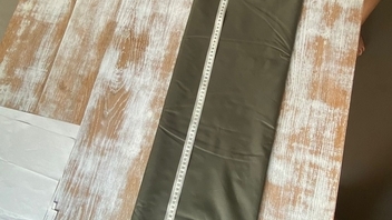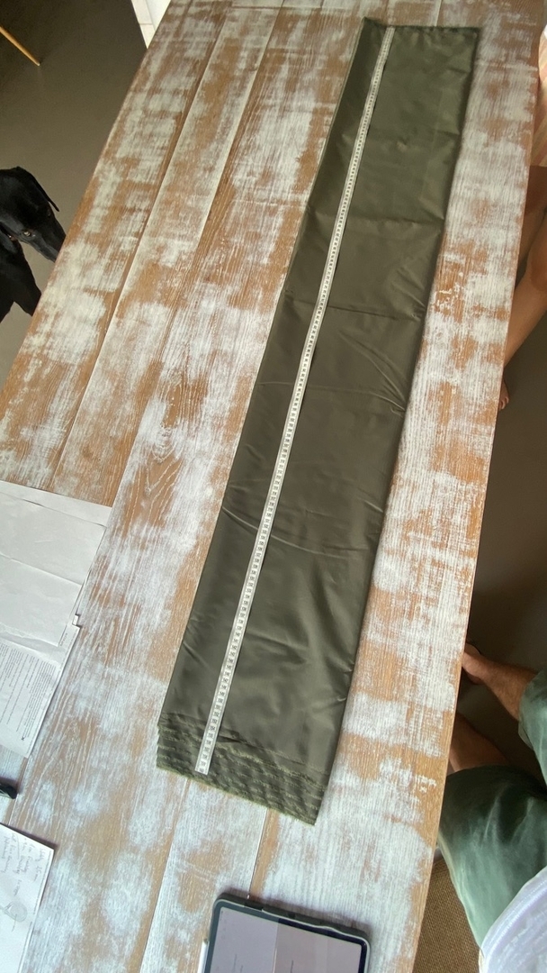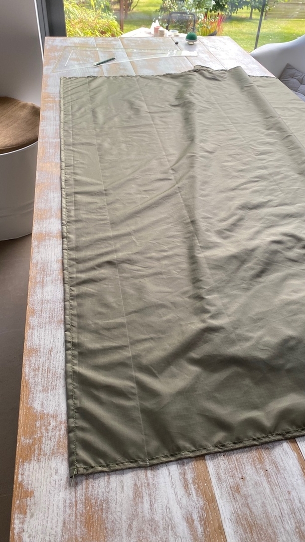 Der erste Schritt war, den Stoff zu begradigen und auf die Länge zuzuschneiden. Bei mir waren es 364 cm, da ich auf eine Endlänge von 350 cm kommen wollte.