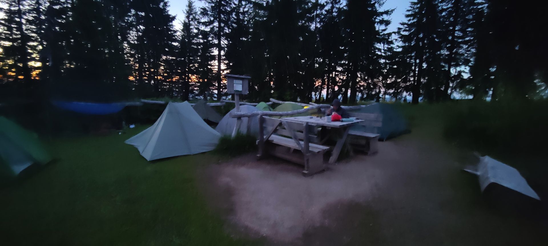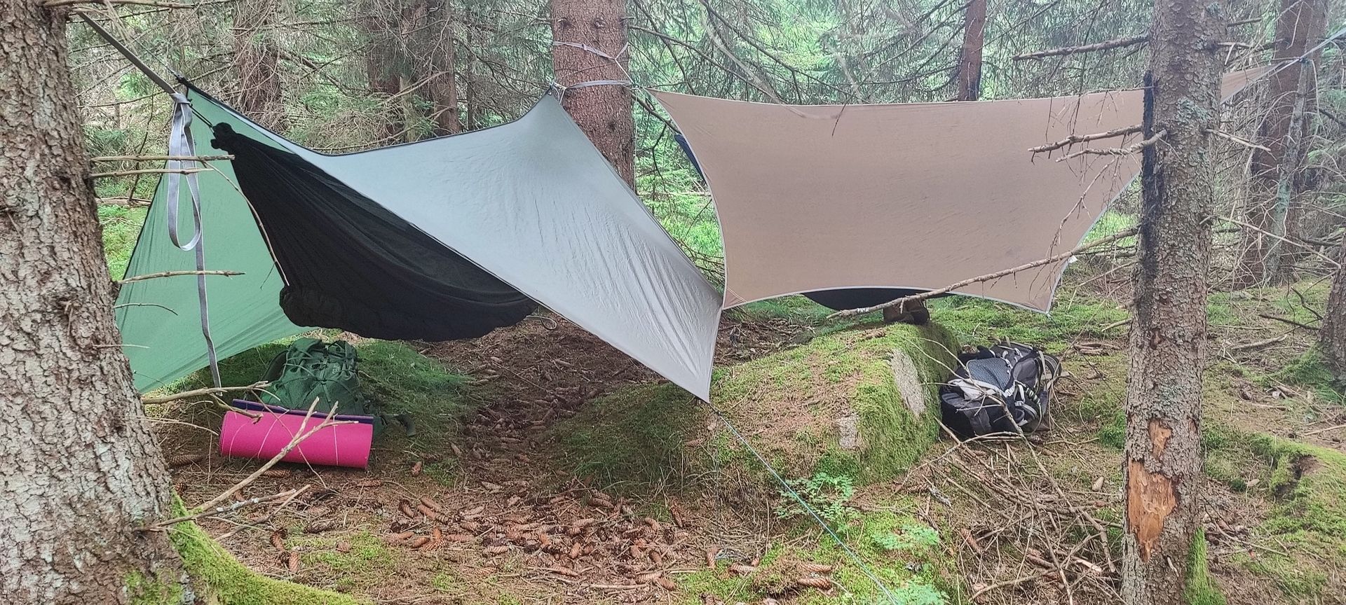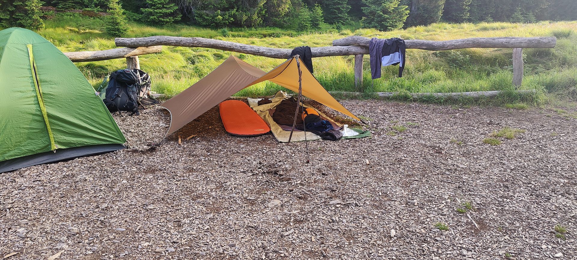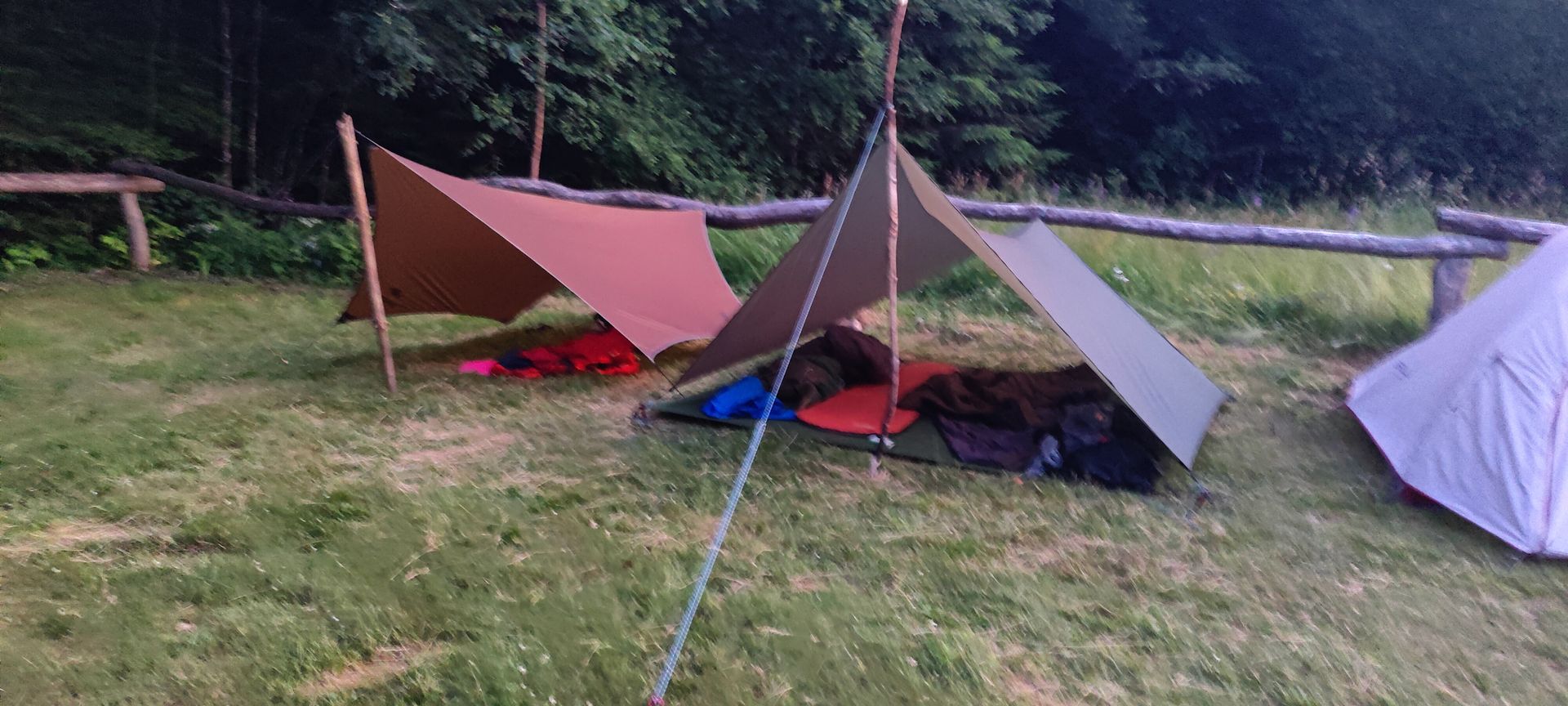 Danach sind wir zum Zeltplatz den Berg hoch gestapft. Da Strazny direkt an einer Schnellstraße liegt, die man unten im Ort deutlich hören konnte, war am Lagerplatz weiter oben nichts mehr davon zu hören. Wir sind die umliegenden Wege noch etwas abgelaufen und haben mal wieder nach Hängemattenplätzen geschaut. Diesmal war leider gar nichts zu machen. So waren wir diese Nacht alle unterm Tarp auf dem Boden.