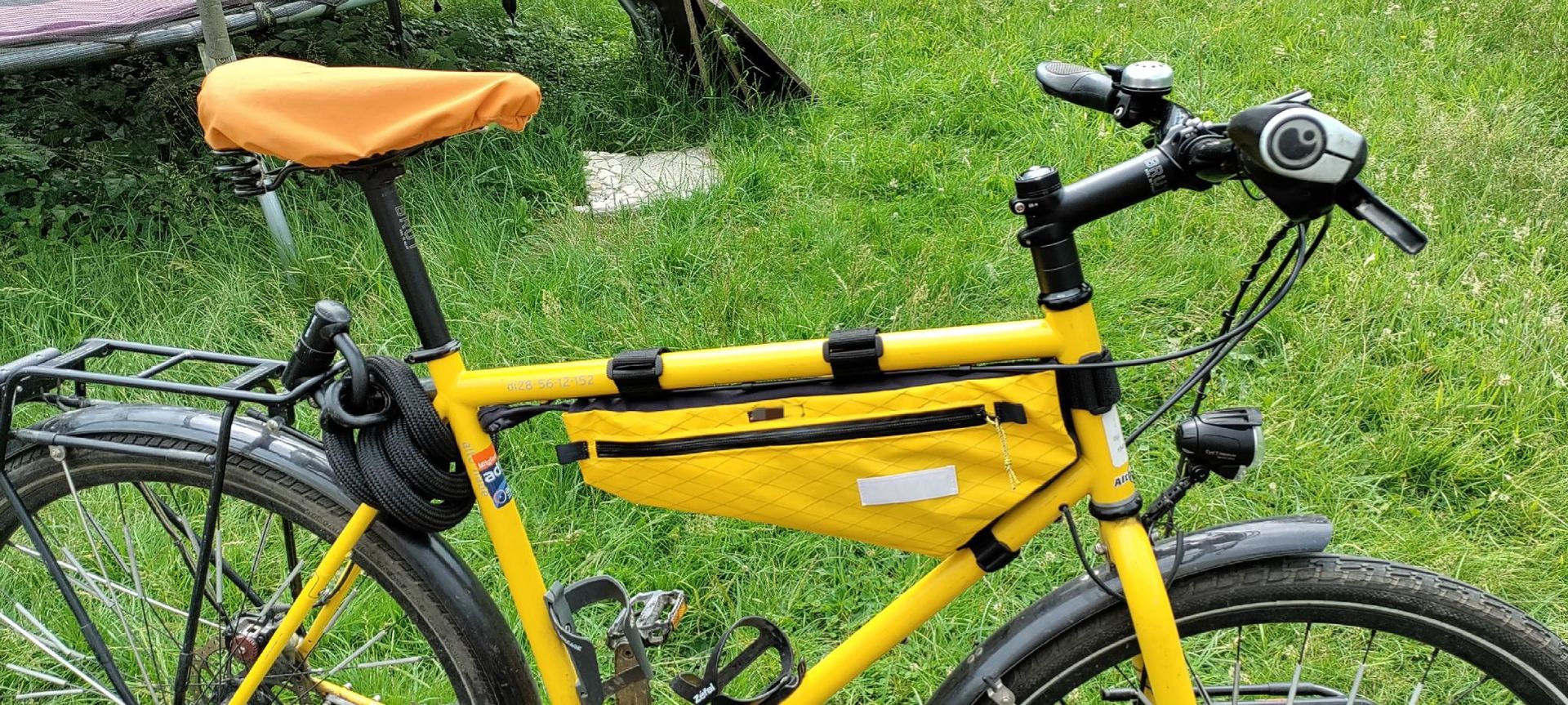 Für mein Fahrrad wollte ich eine möglichst regendichte Rahmentasche anfertigen, die genau in die Rahmengeometrie passt und beim Entnehmen von großen Trinkflaschen aus den Flaschenhaltern nicht im Weg ist.