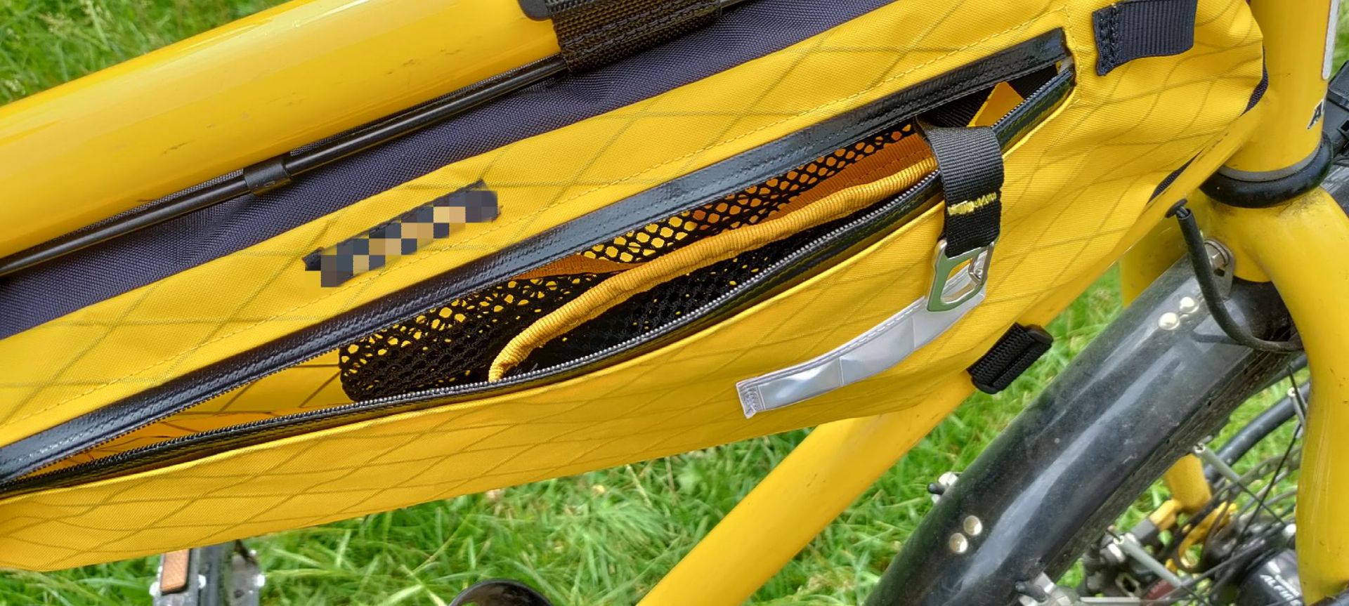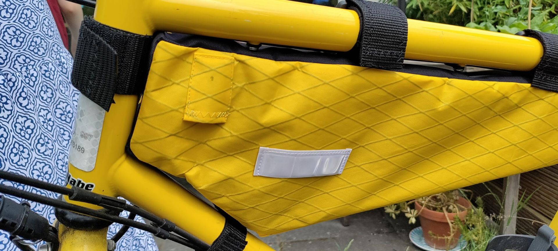 Damit die Tasche nicht durchhängt und trotzdem mit nur zwei Klett-Gurten (40mm) am Oberrohr hält, habe ich sie innen mit zwei Bambusstäben verstärkt. Die Stäbe laufen auf der Innenseite durch Schlaufen auf der Höhe der Klett-Bänder und sind am Ende in kurzen Gurtband-Tunneln fixiert. Den einen Tunnel kann man mit Klett öffnen, so dass man zur Not die Stäbe entfernen kann.
