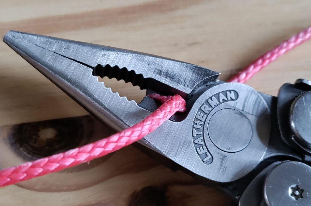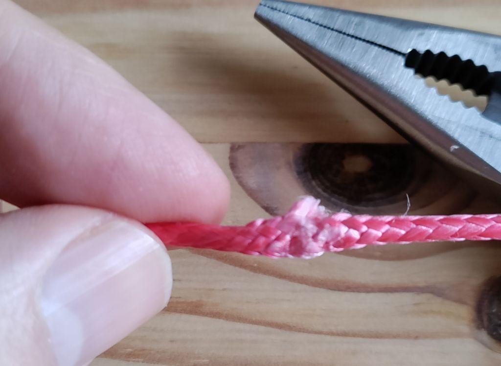 Dazu habe ich hinten (auf dem Photo unten links) einen Corduraschlauch in einer Schlaufe angenäht. Im Inneren habe ich einen alten Bremszug vom Fahrrad vierfach als Ring gelegt und die Enden zusammen gekrimpt.