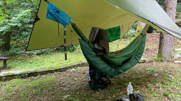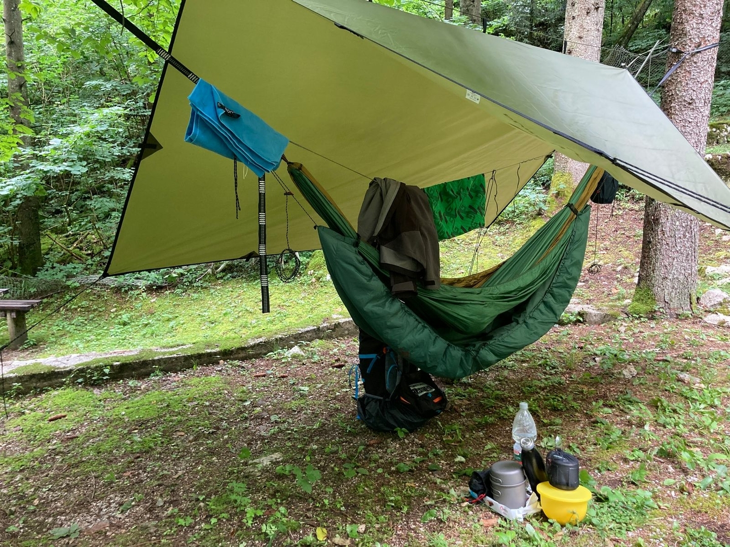 Das Buch war echt eine coole Sache und echt super verständlich aufbereitet. Ohne dem wäre ich nie auf die Idee mit den Tropfschnüren gekommen und die Diagramme mit den Knoten waren auch ein Lebensretter, als mir beim Abspannen vom Tarp die billigen Plastik- Spanner abgebrochen sind. ![]()